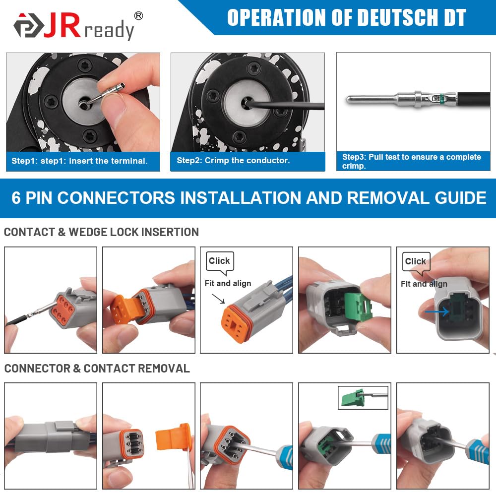Applicable Crimping Tools: Recommended JRready ACT-DT1 Crimping Tool. This Deutsch crimping tool is suitable for crimping size 12# 16# 20# turned pin/socket contacts.