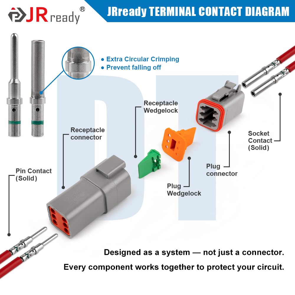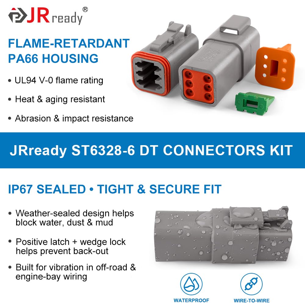 6 Pin DT Connector Versatility: JRready connectors offer reliability and performance widely used in truck, bus, off-highway, construction, agriculture, mining, emergency vehicles, forestry, recreational marine, motorcycle on the engine or transmission, under the hood, on engine controls, solenoid interfaces or in the cab.
