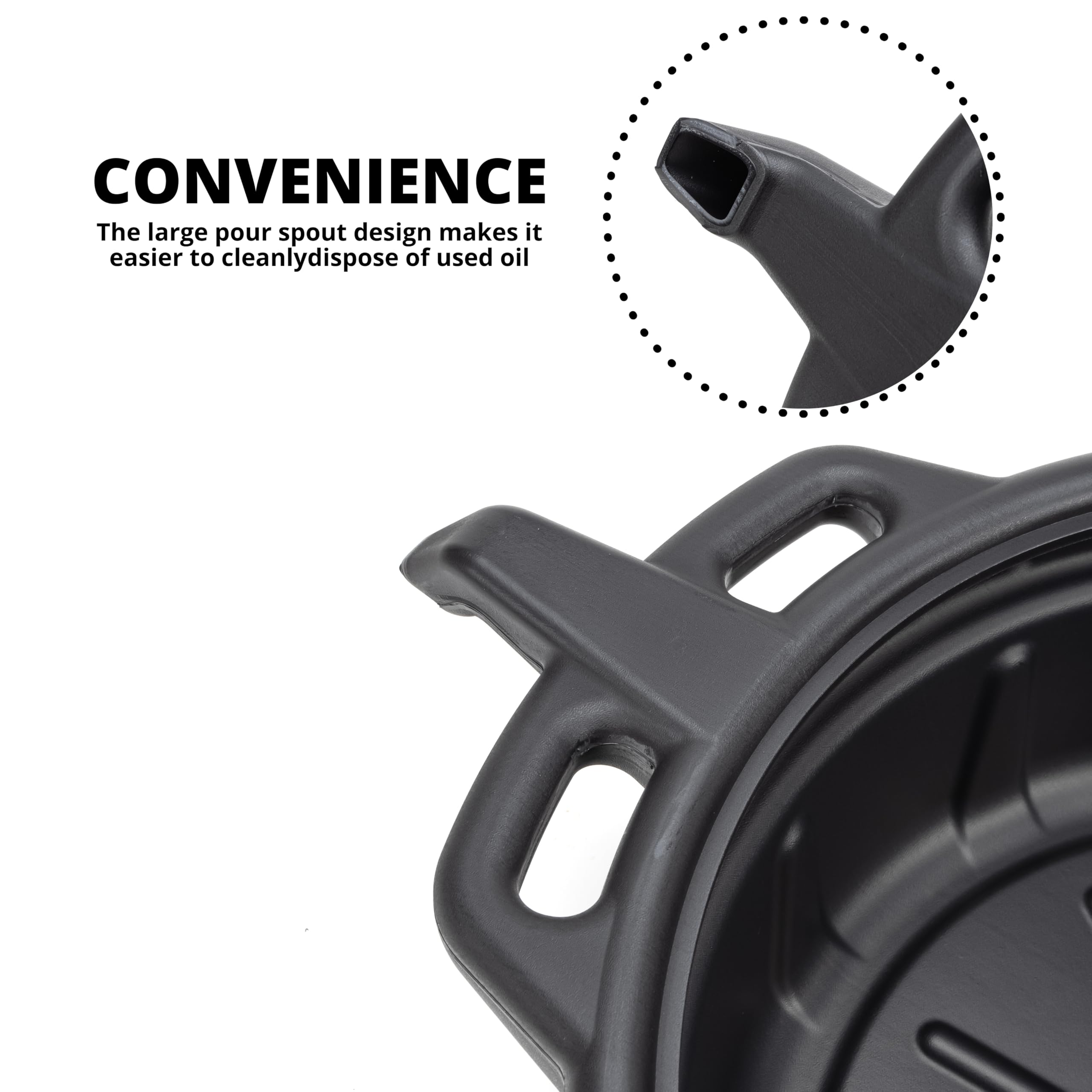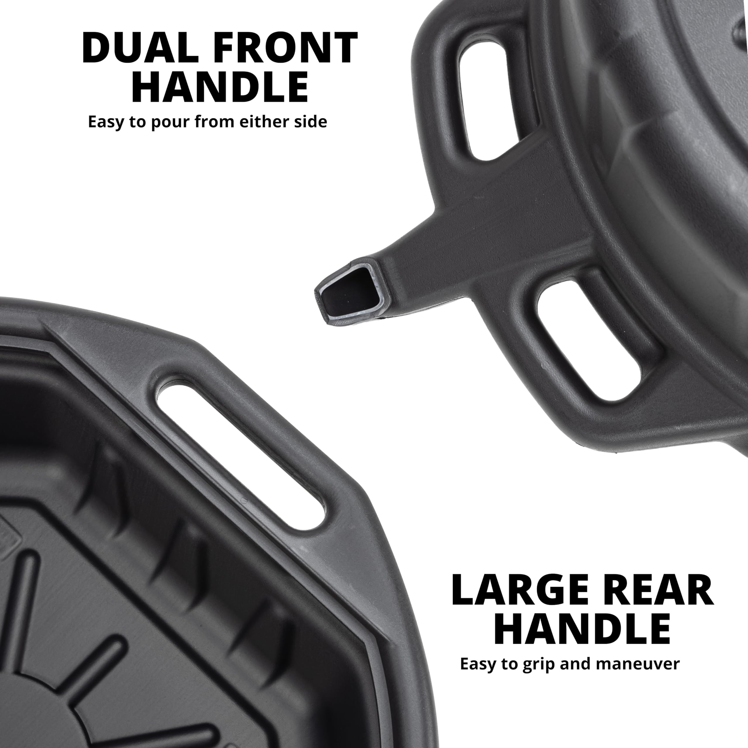 POUR SPOUT: Portable oil drain pan for oil change with grip handles on both sides of the pan makes for easy transportation and built in spout makes for easy draining and transferring of fluids.