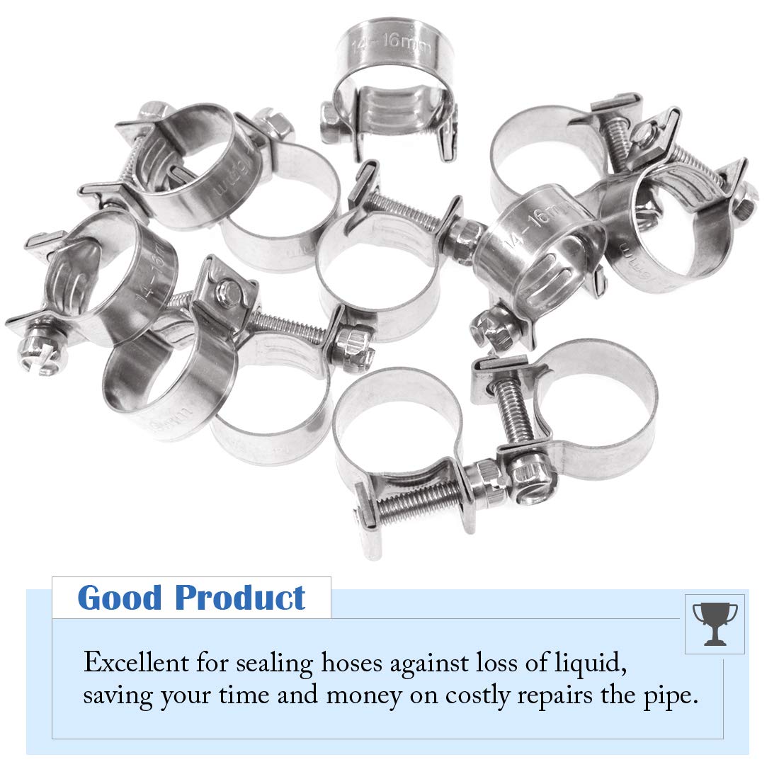 Glarks 12Pack 14-16mm Stainless Steel Mini Fuel Injection Hose Clamps Adjustable Pipe Hose Clip Tube Clamps Set (9/16''-5/8'' Dia) ♛【Specification】: Product Type: High precision fuel injection style hose clamps Material: 304 stainless steel Clamp Range: 14-16mm(9/16''-5/8'') ♛【Product Feature】: ♣ High quality 304 stainless steel, with strong corrosion and acid resistance, will not rust and break. ♣ Screws are adjustable so that you can adjust the size according to the diameter of the tube. ♣ Clamps are edge polished smooth to hold securely and without damaging the hoses. ♣ Attach the hose clamps on hoses pipe joints to prevent liquid leakage for saving your time and money. ♣ Widely used in various diesel petrol pipe, home use, auto repair, marine, plumbing, farm, ranch, industrial. ♛【Package Detail】: 14-16mm(9/16''-5/8'') hose clamp x 12pcs ♛【Warm Note】: ♥ Please check the specific size of the product according to the second picture. Due to manual measurement, there may be errors, please don't mind. ♥ Quality Assurance: If you receive a defective product or have any problems during use, please feel free to contact us, we will provide return and exchange service at any time.