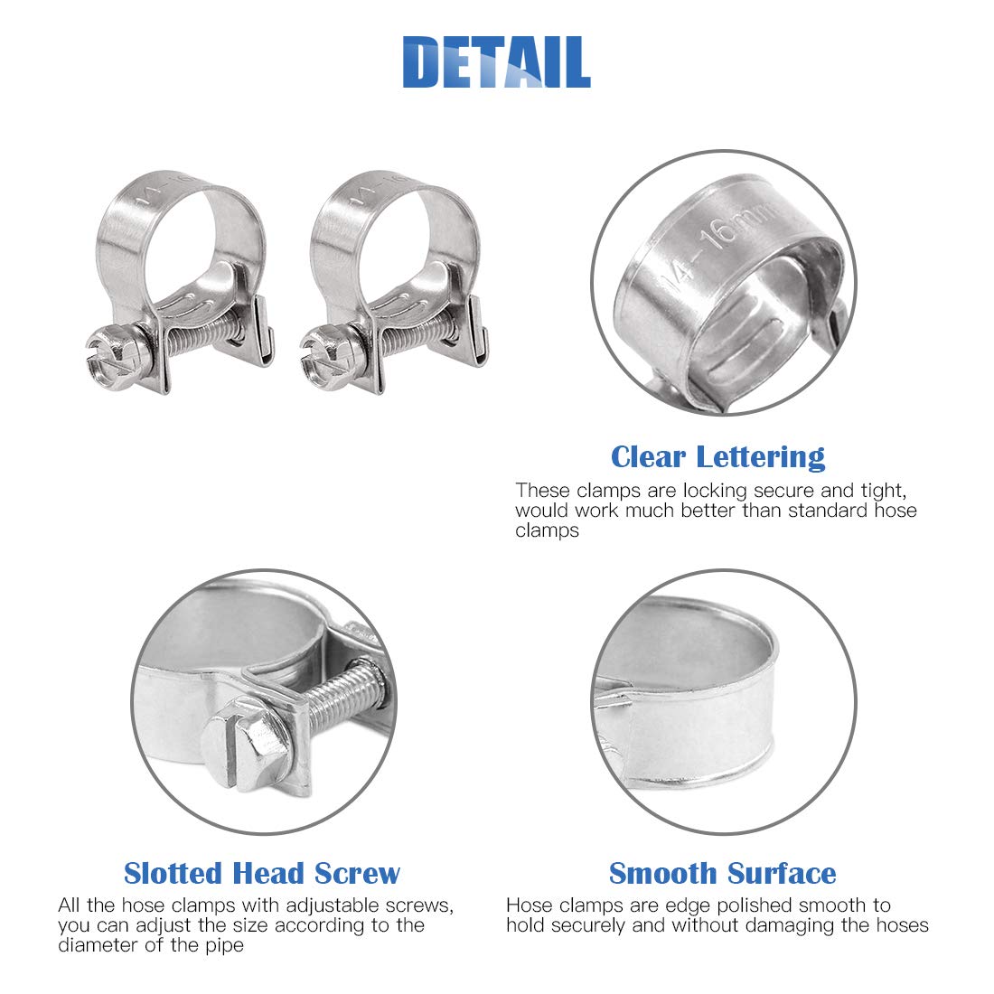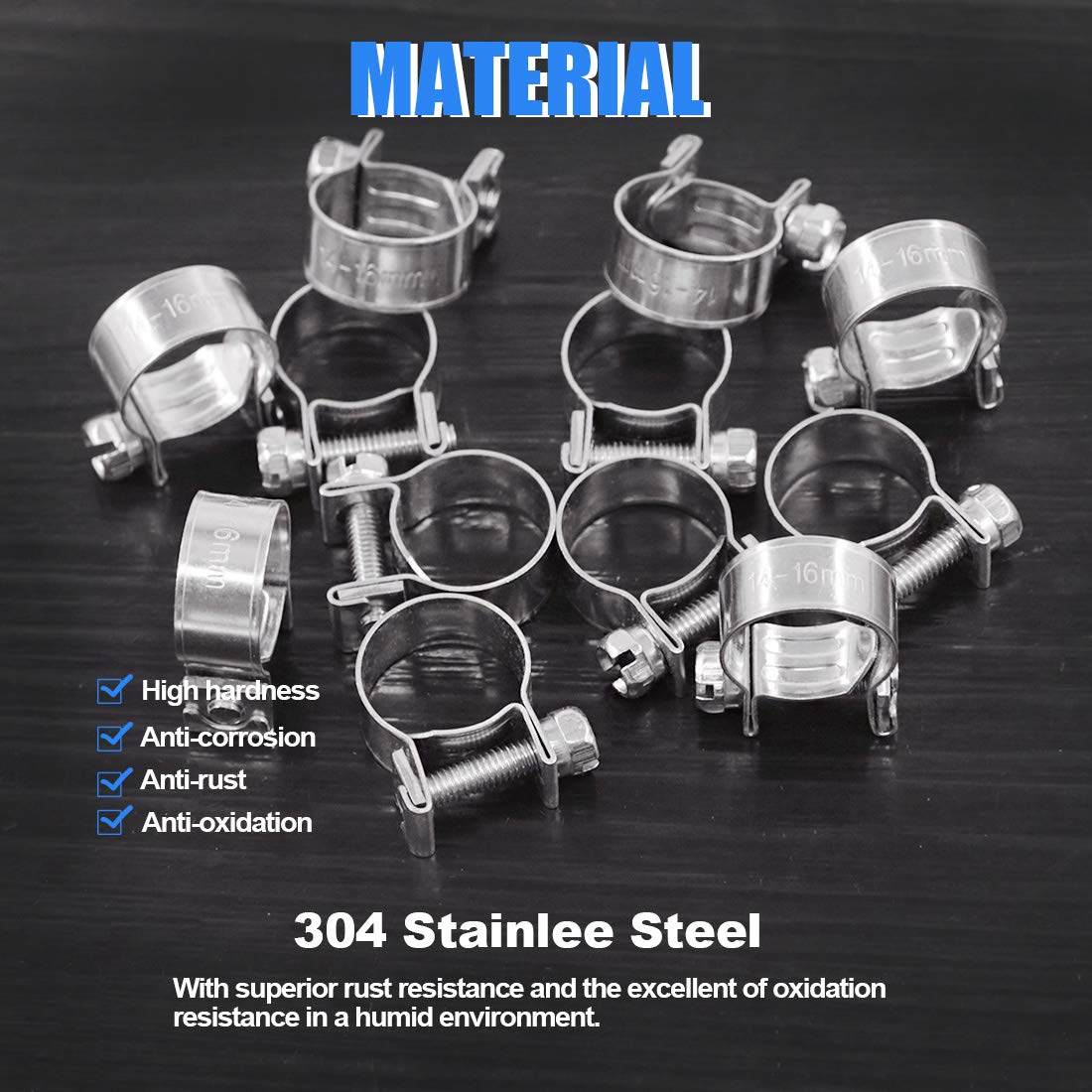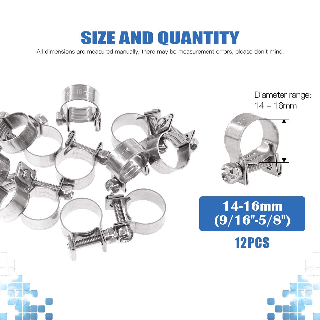 ☀【Package Include:】In this set, we provide 12pcs 14-16mm mini style fuel injection hose clamps, which diameter is 9/16''-5/8''.