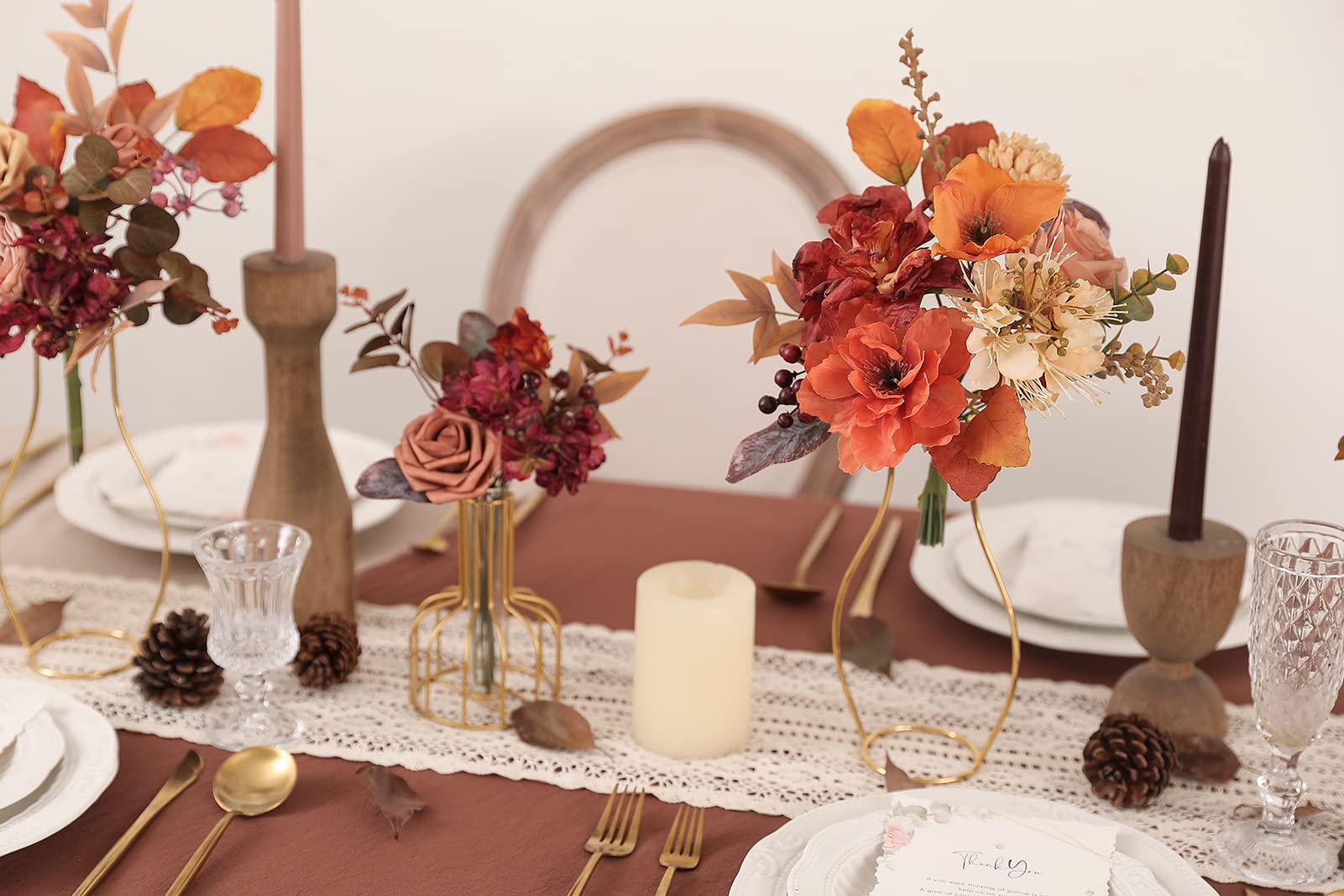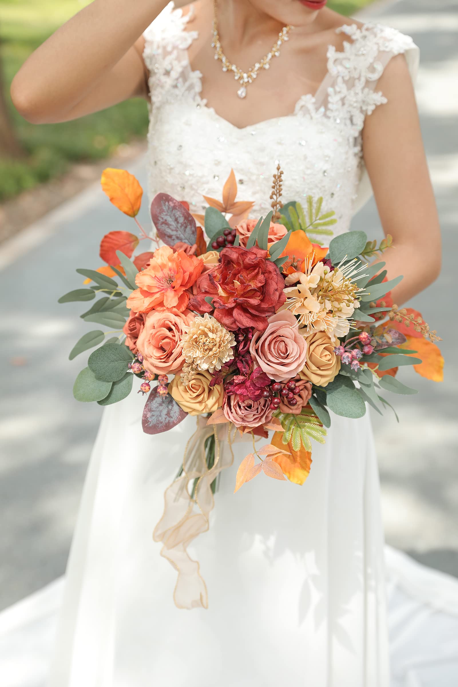 【Unique Design】This artificial flower set is made up of various artificial flowers, its burgundy and orange silk roses set the tone of romance and love, which will be a perfect bouquet on your sweet and unforgettable wedding.