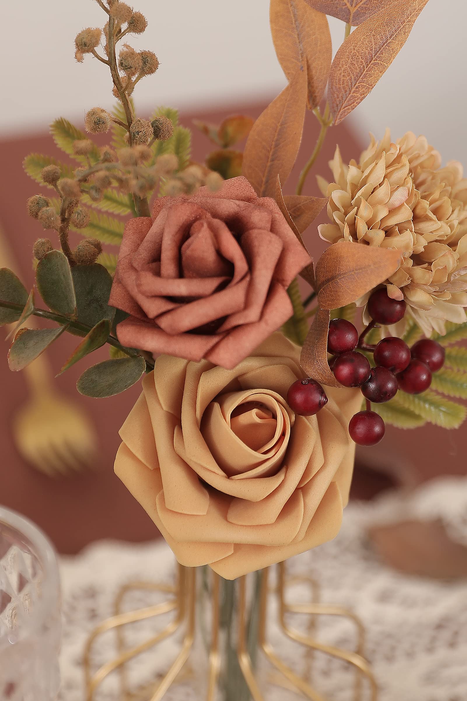 【Package include】—Foam Rose: Golden Yellow X3,CoffeeX4,—Silk roses:Burnt Edge Rose Burgundy X1,Coffee X2,Light Coffee X1,Curled coffee roseX1,Khaki daisy X1,—Silk Hydrangea:Burgundyx2,Artificial Peony OrangeX2,Phoenix flowerX1,Eucalyptus purpleX4,Christmas fruitX3.Includes Eucalyptus / Willow Leaves, 8 different plant leaf accessories. There are plenty of flexible plant stems for DIY .