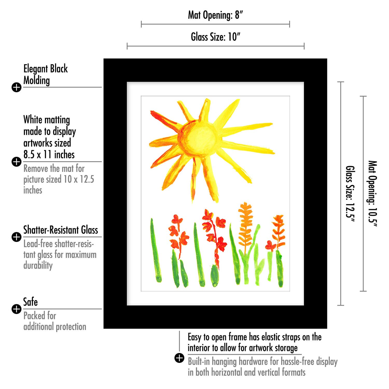 Turn every drawing, doodle, and masterpiece into a gallery-worthy showcase with our frames for kids' artwork. Matted for 8.5x11 or fits 10x12.5 without the mat (8x10.5 display area). Sleek 2" molding adds sophistication to your child’s artistry.
