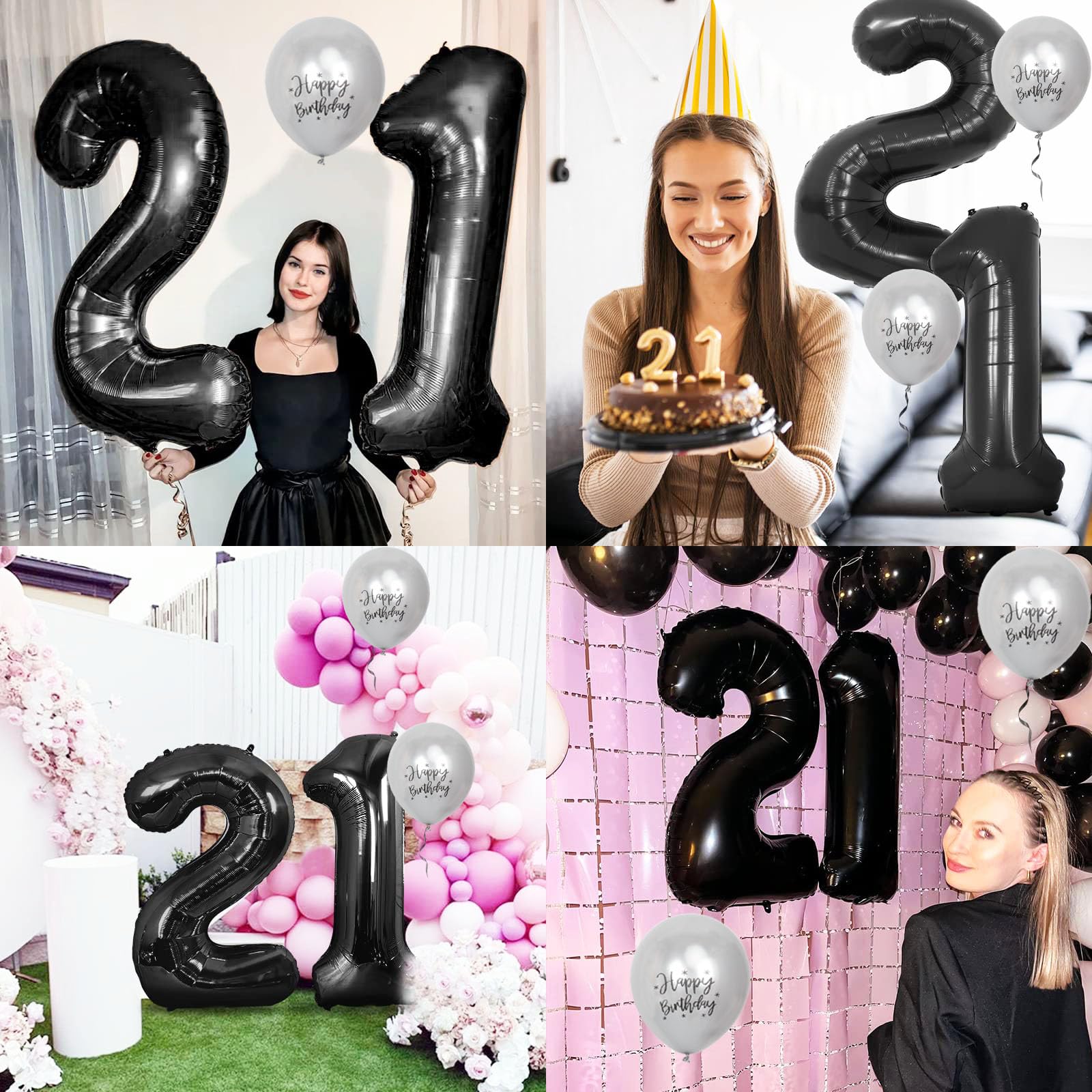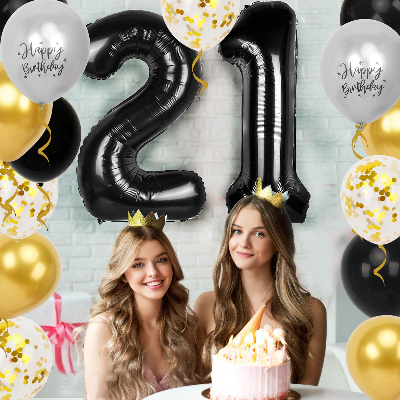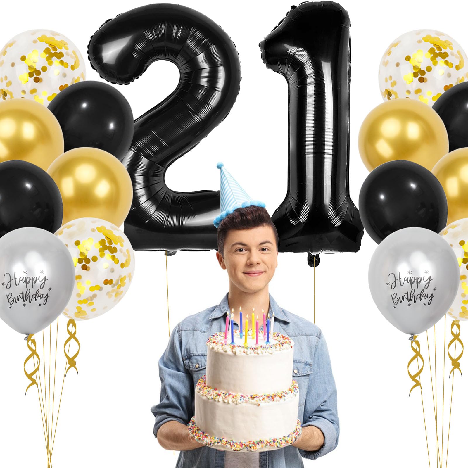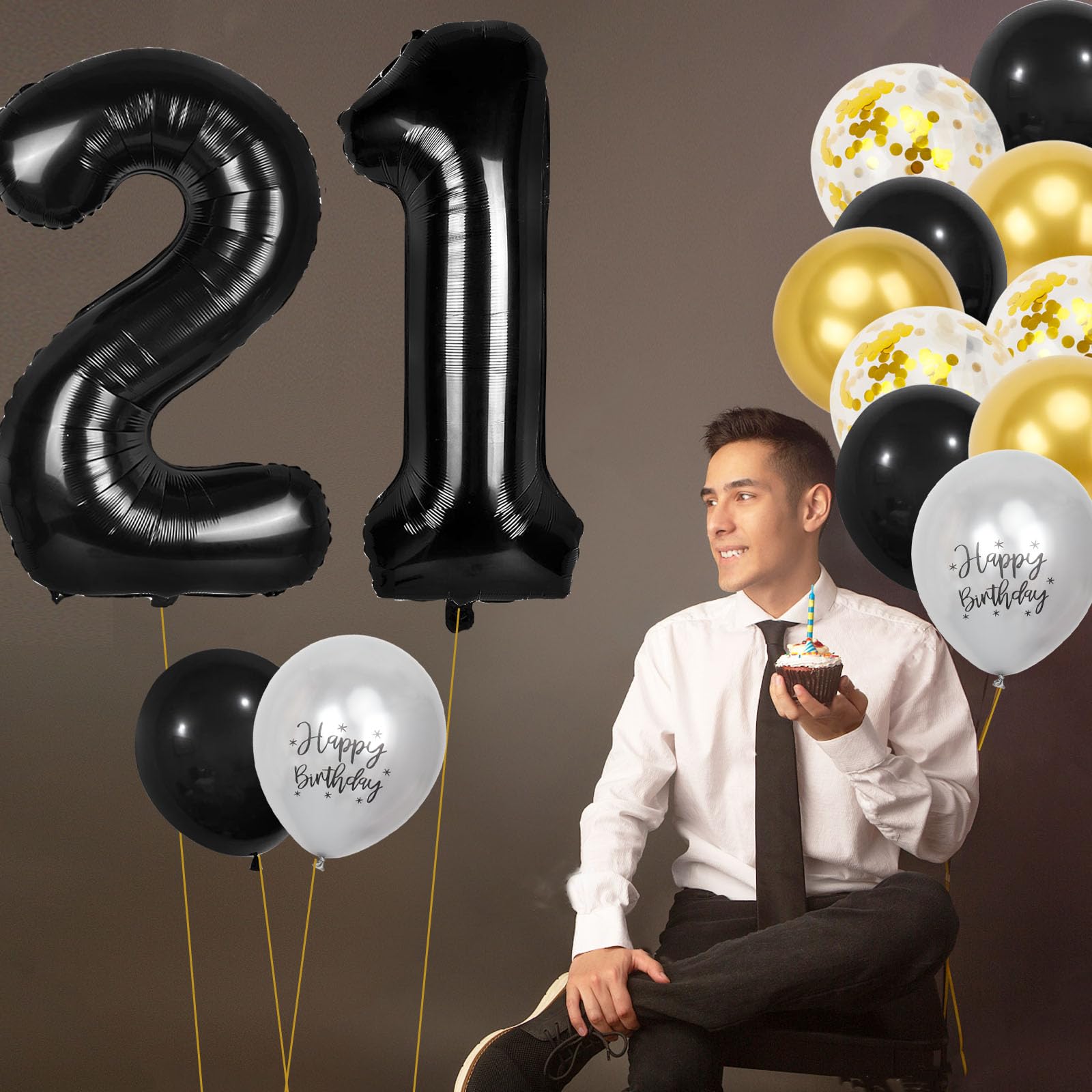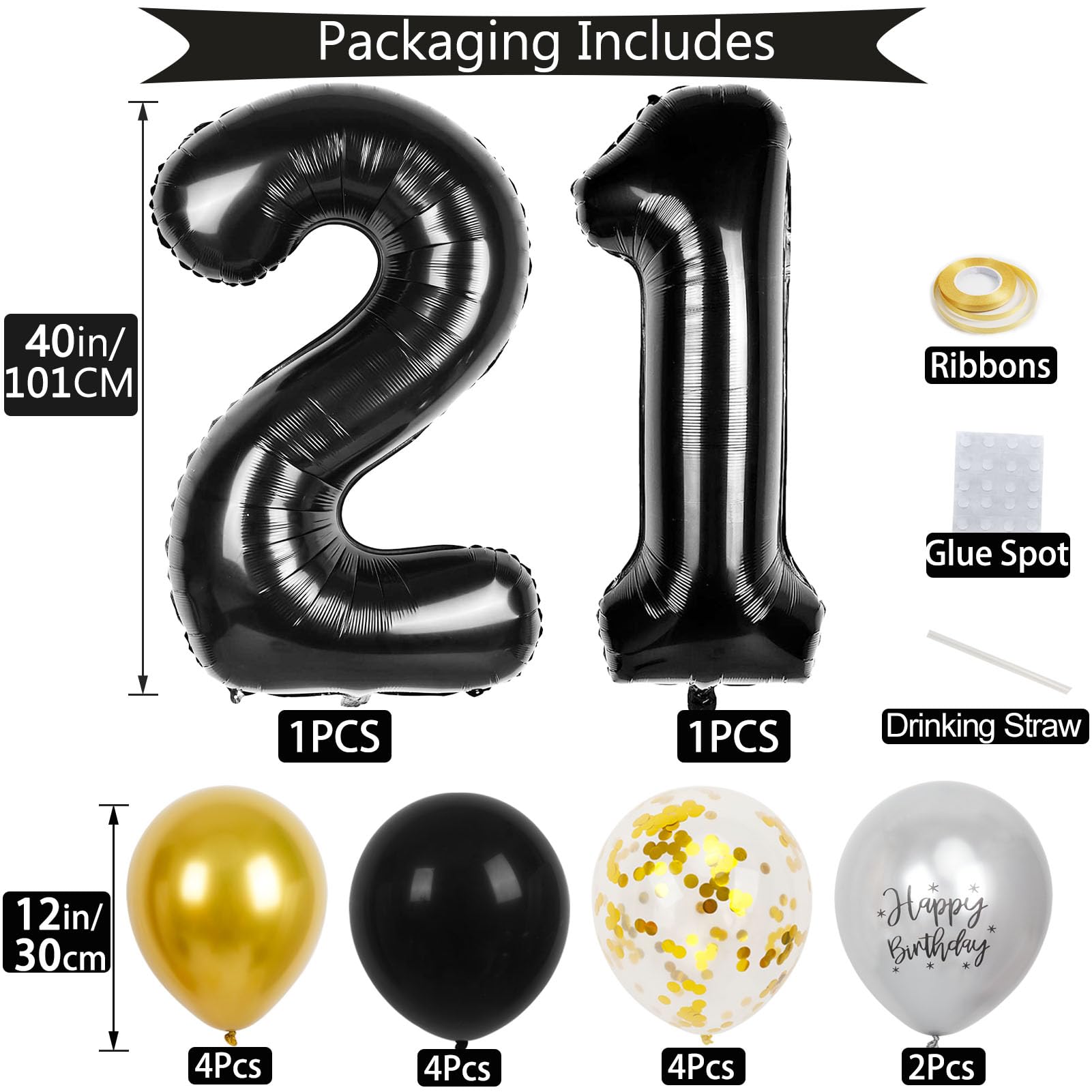 21st Birthday Decorations for Him Set: Package includes 2 pcs large 40 inch black 21 balloon numbers, 4 pcs 12-inch gold metallic balloons, 4 pcs 12-inch gold confetti balloons, 4 pcs 12-inch black latex balloons, 2 pcs 12-inch silver metallic birthday balloons, 1 gold ribbon, 1 piece of straw 1 sheet of glue dots. This 21st birthday decorations is perfect for celebrating your 21st birthday or 21st anniversary decorations and makes your party even more exciting!