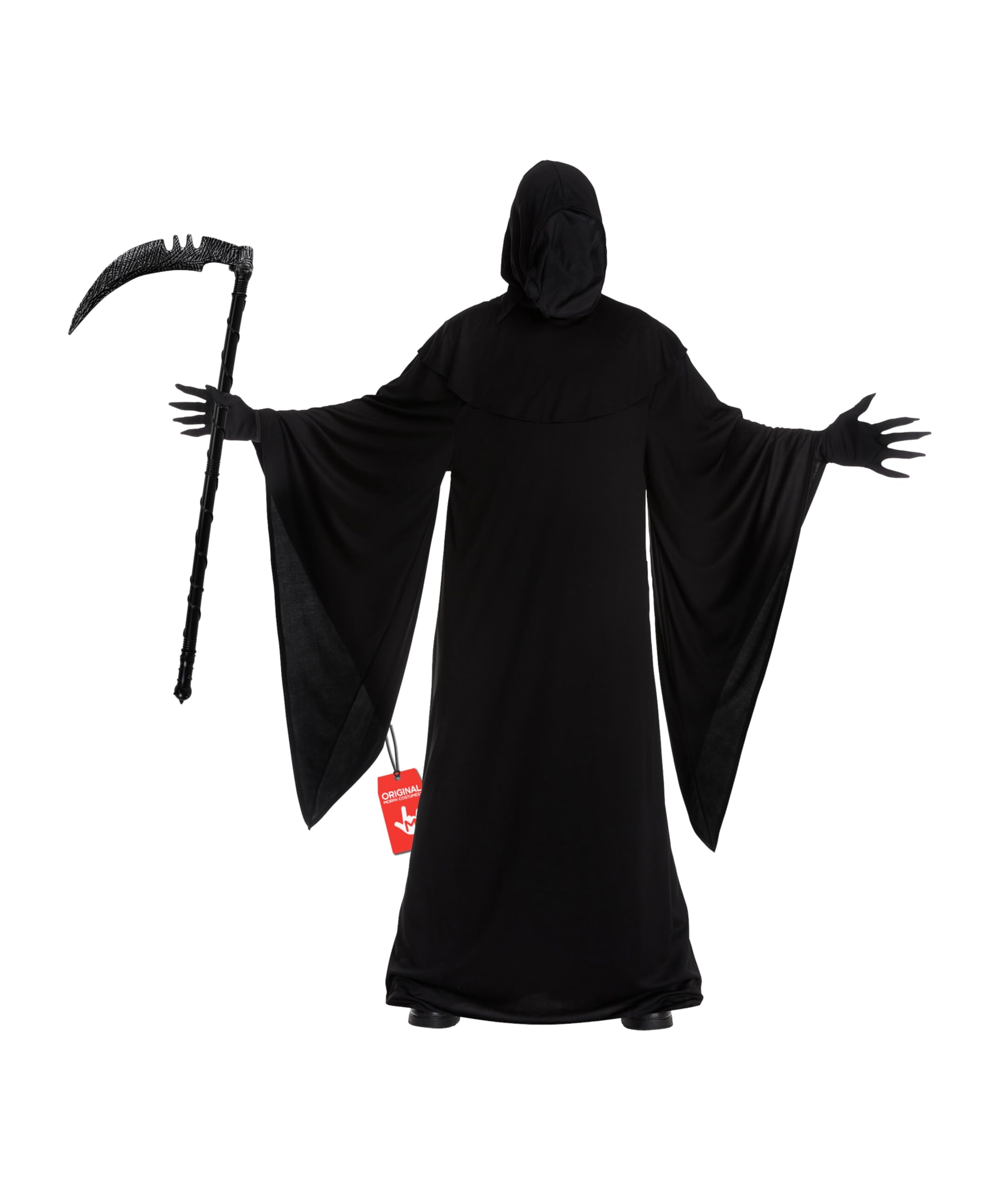 Our mens reaper costume includes: one black hooded robe, removable face cover that secures with velcro, and gloves. Also included is the reaper scythe accessory!