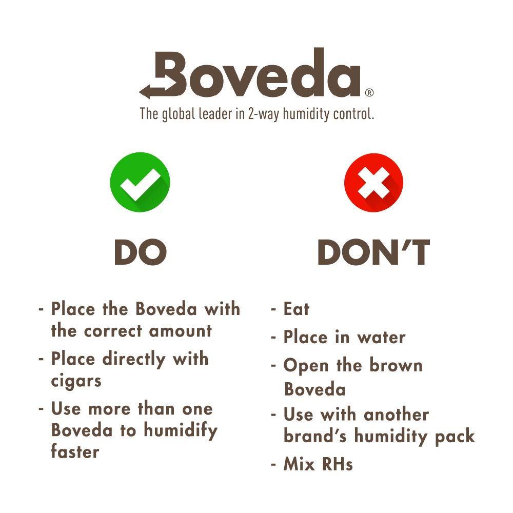 HOW BOVEDA WORKS: Boveda 69% RH keeps items fresh by stabilizing the humidity inside a humidifier box. If the air inside your container is too moist, Boveda absorbs that moisture. If it's too dry, Boveda releases moisture into your container to bring what's inside back to life. ADD A BOVEDA PACK RIGHT AWAY TO A HUMIDIFIER BOX WITH NEW PREMIUMS. You can also use Boveda 69 to restore overly dry items to their original flavorful, aromatic state—the way the master blenders intended.