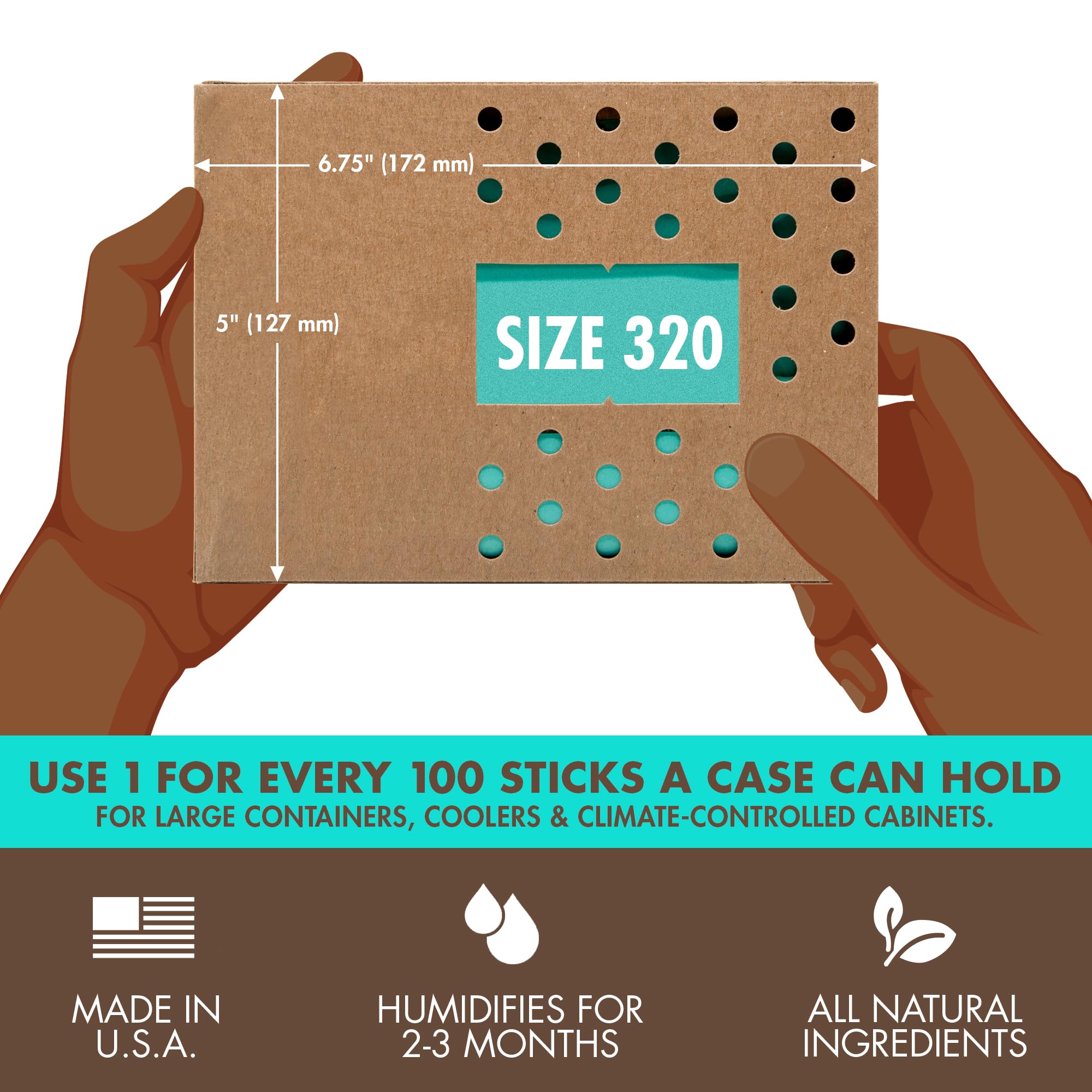 WHY THIS BOVEDA: Versatile! CONTROLS HUMIDITY IN ANY SIZE CONTAINER. ONE (1) Size 320 = FIVE (5) Size 60. 69% RH is the sweet spot for storing premiums in bins, coolers & climate-controlled cabinets & electric coolers that have Spanish cedar trays & shelves. Use one Size 320 for every 100 TOTAL items the humidifier box can hold. NATURAL INGREDIENTS. WE GUARANTEE QUALITY!