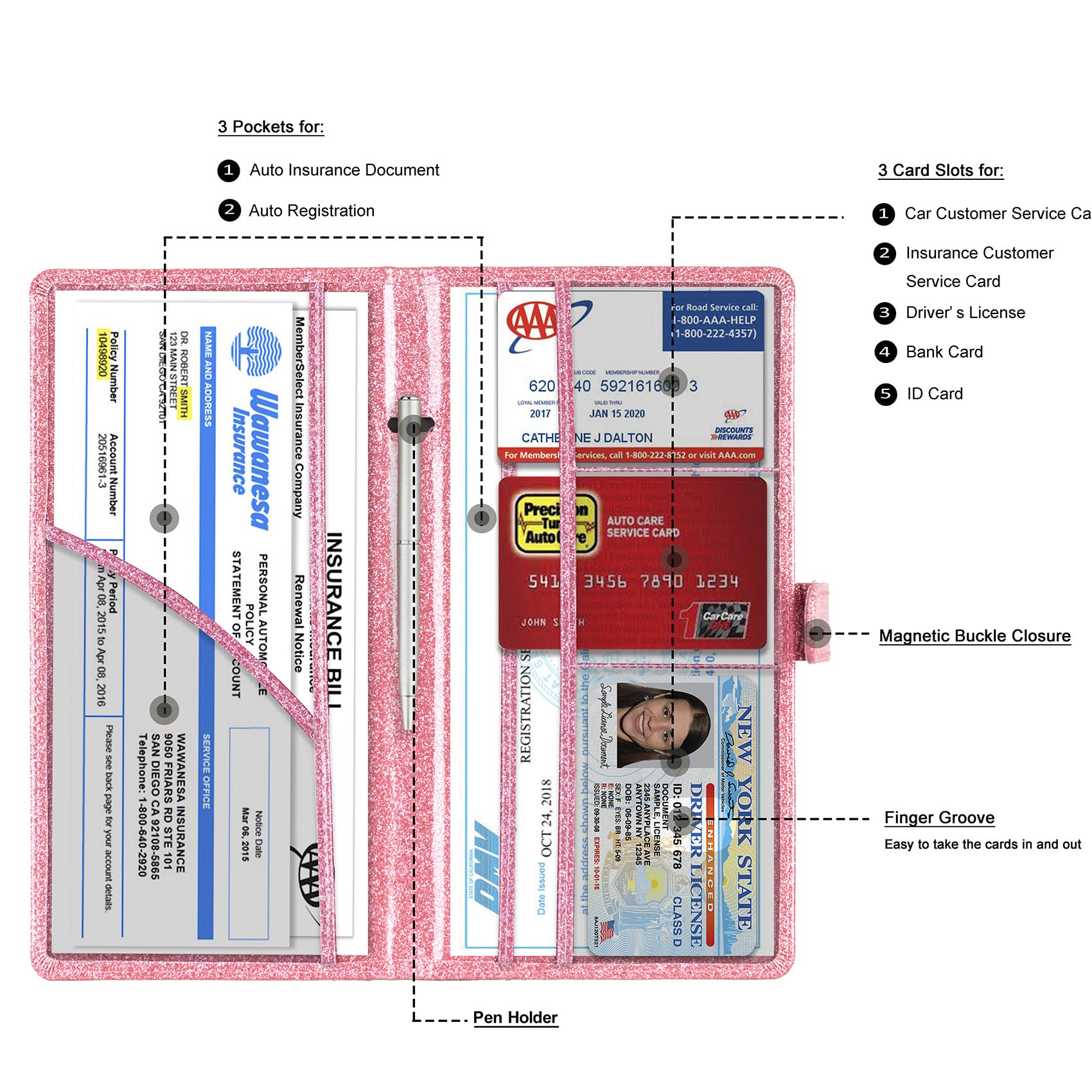 Document Well Organized: The leather car document holder keeps your car documents organized and keep them tidy and secured, which make it easy to quickly identify and reach paper or cards in the folder. The girl car accessories interior has 6 compartments to keep all your auto car essentials organized, such as insurance card, vehicle registration, driver's licenses or other valuable auto documents.