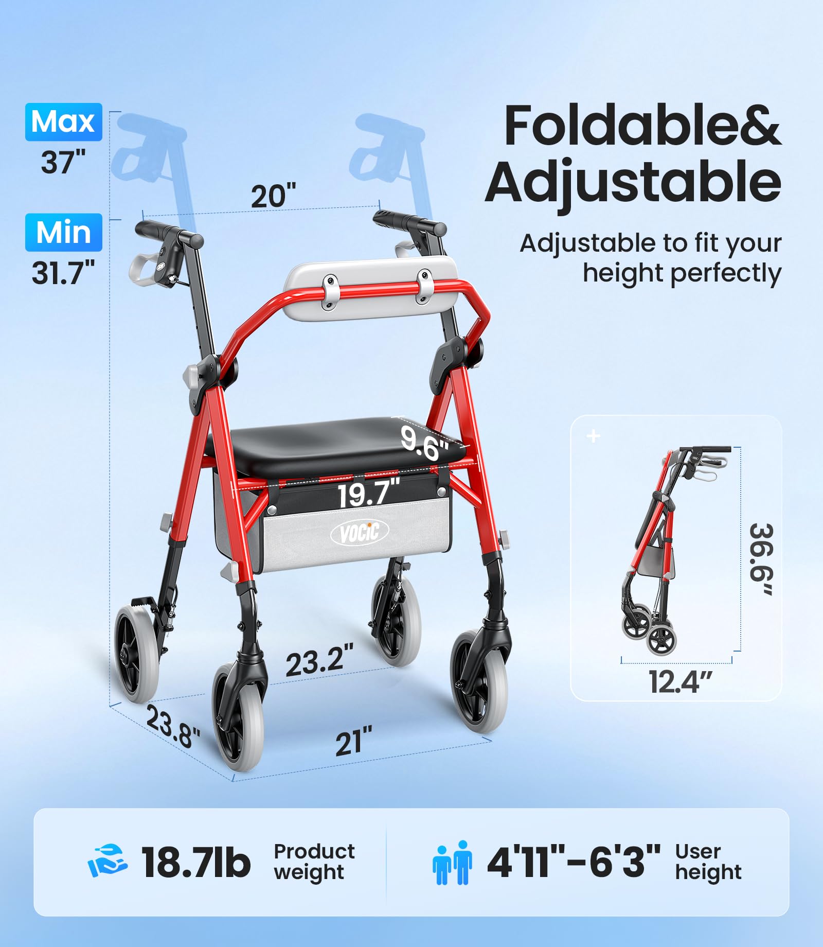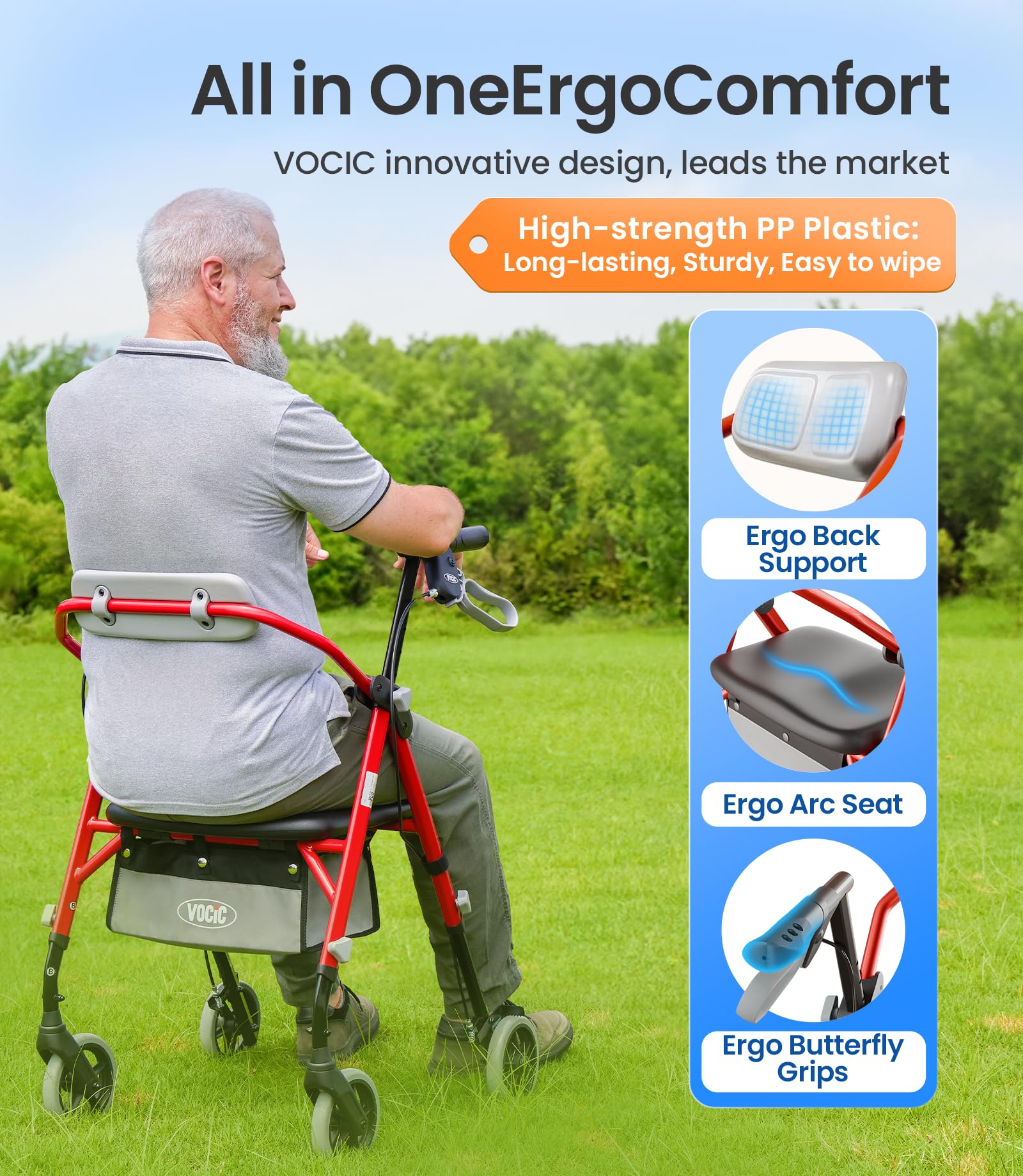 【All-in-One ErgoComfort】VOCIC walker features innovative Ergo Cushion, Curved design offers zero pressure. Ergo Dual-arc Back Support, provides firm and reliable back support. Ergo Butterfly Grips, wrist friendly, effortless braking.The triple-link system is scientifically designed to deliver all-day comfort with every second.
