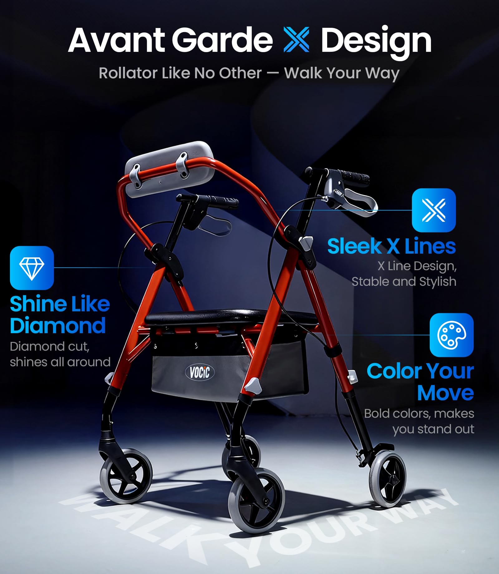 【Avant-Garde X Design】Crafted with purpose, the modern Z11 X-Way Rollator features sleek X line that blend Stable and Stylish. Its Multi-faceted tubing reflects light like diamond, while the striking color combinations highlight your unique taste. Perfect for city walks, social outings, or travel, you'll always stand out with confidence, expresses individuality and elegance.