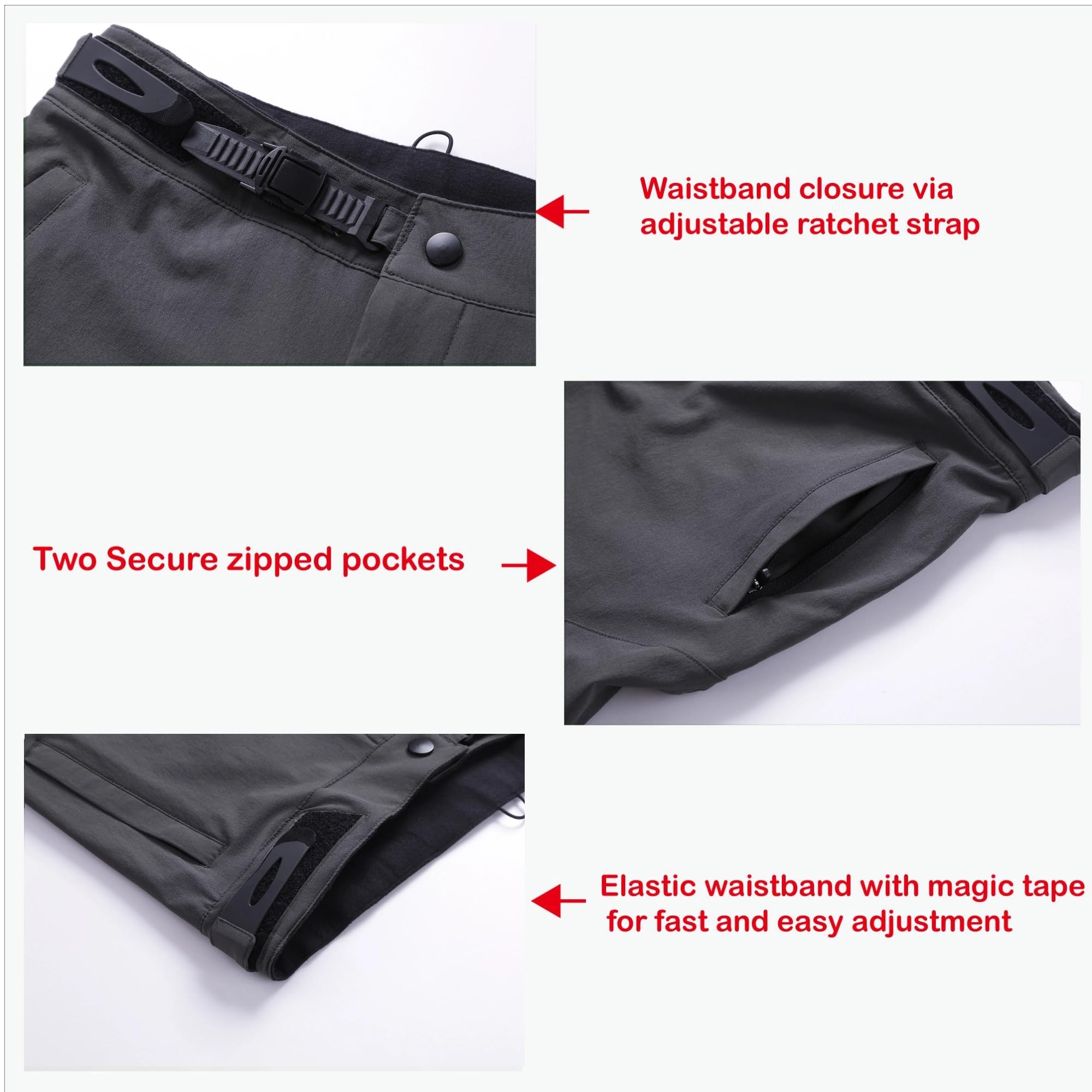 【Adjustable Waist Design】: These Bmx pants have Waistband closure via adjustable ratchet strap combined with Velcro, it is more convenient to adjust waist size, Great double protection.two side zipper pockets are designed for phone, cards or other valuables.