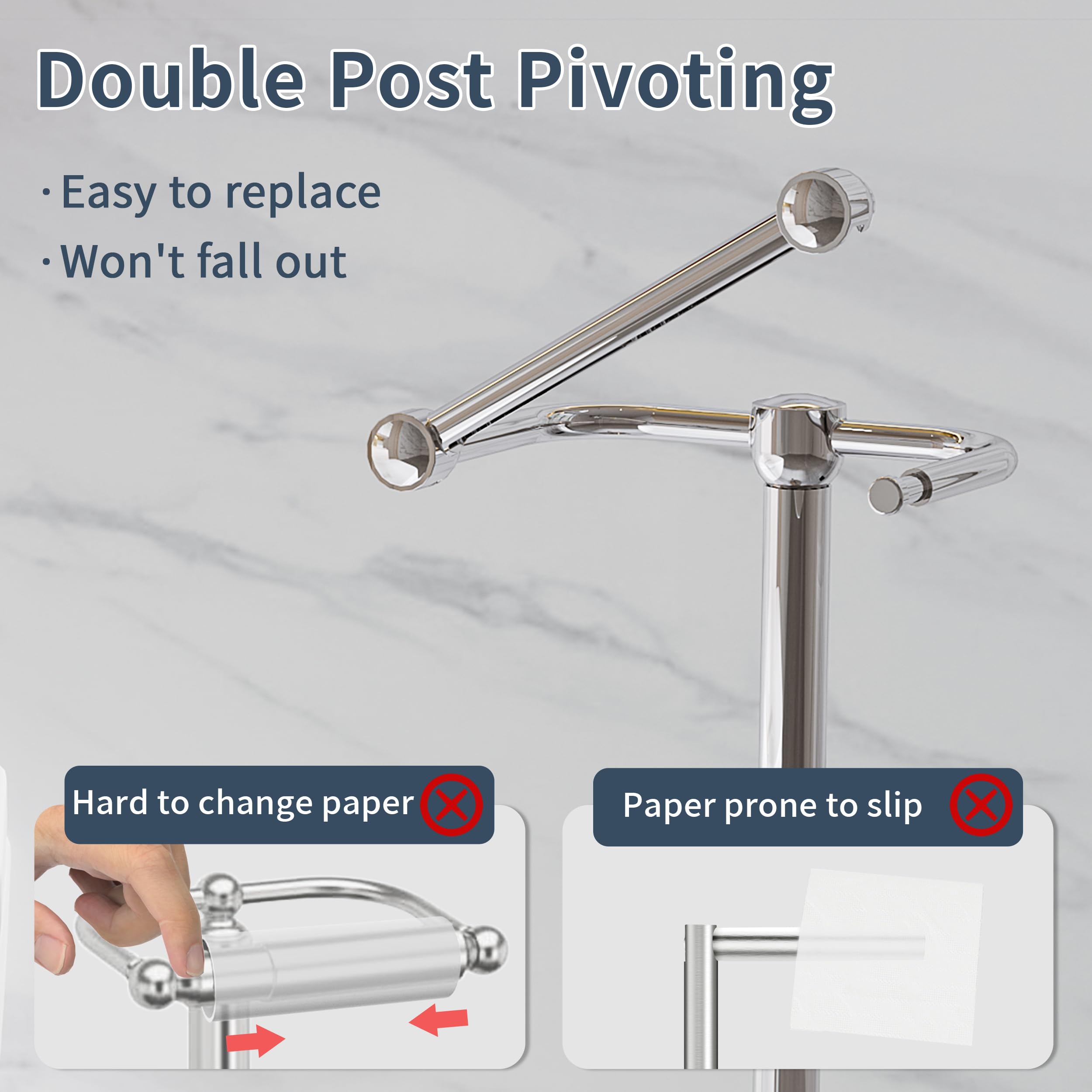 [Double Column Rotation Design] Toilet paper stand's double column rotation design is fits most roll sizes, replacement the toilet paper more effortless. Toilet paper can be firmly fixed and won’t fall off from bathroom tissue holder