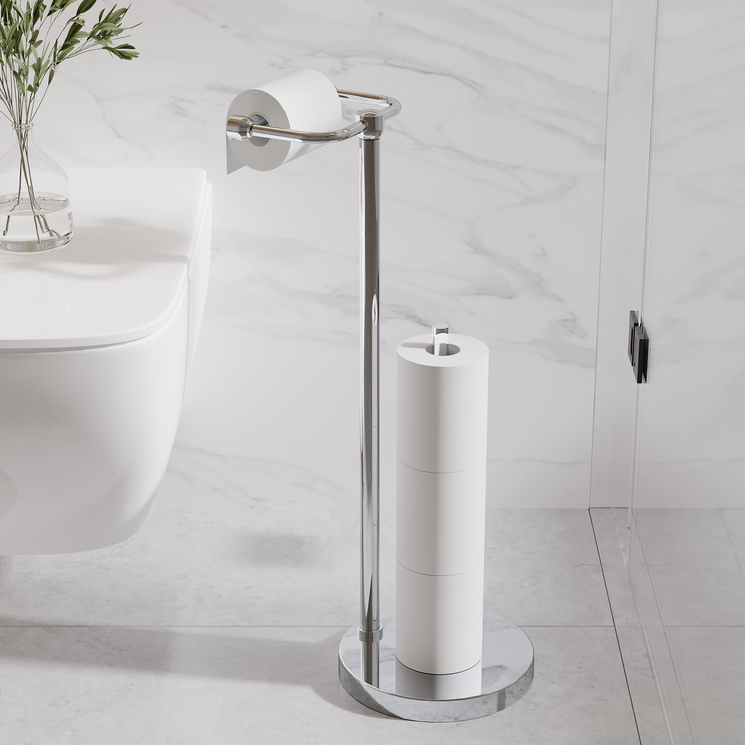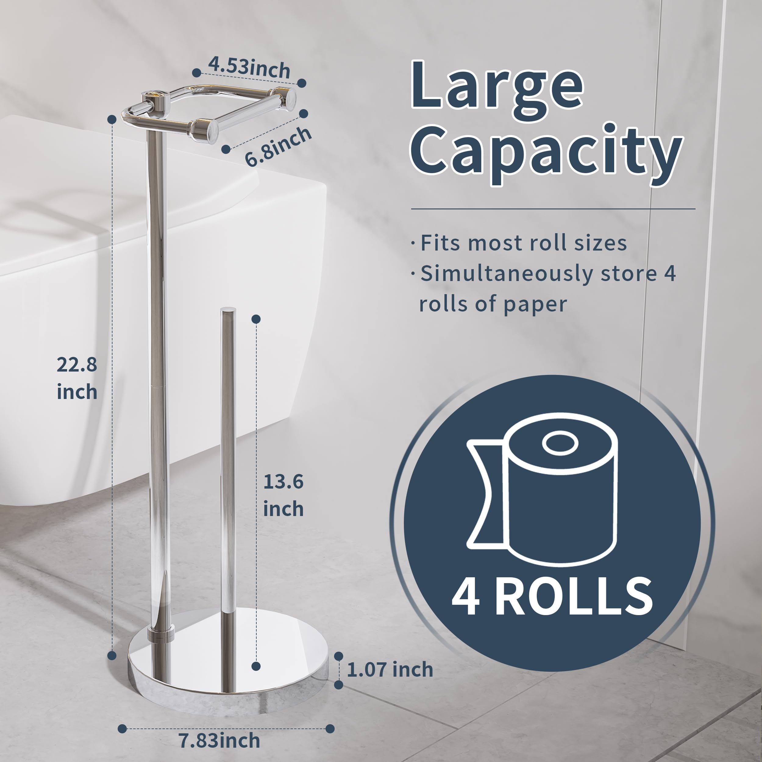 [Enhance Base] Bathroom toilet paper holder has a weighted and heightened base, which allows paper towel holder to maintain stability, prevent toilet paper holder free standing from scratching the ground, while keeping the ground at the bottom of stand alone toilet paper holder dry