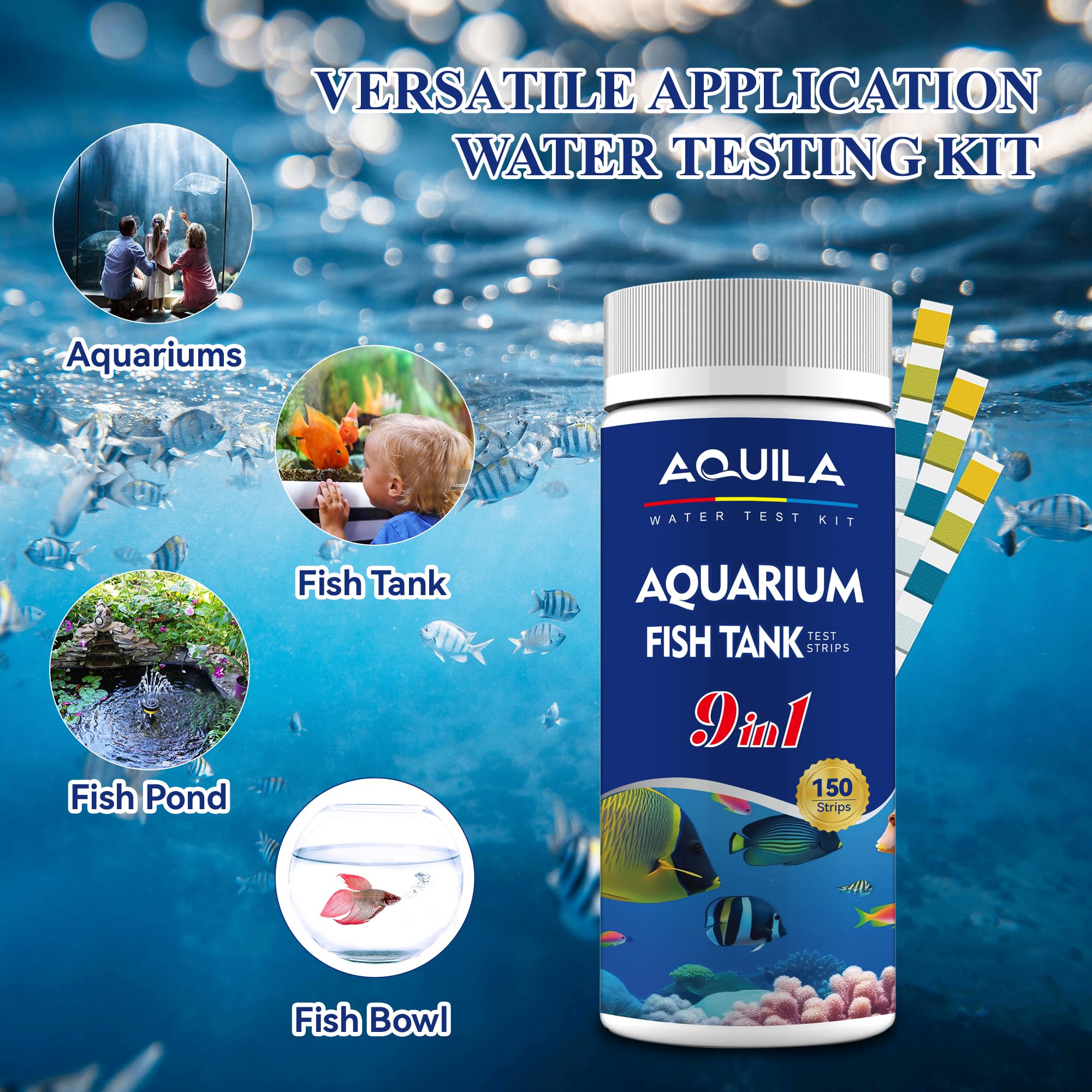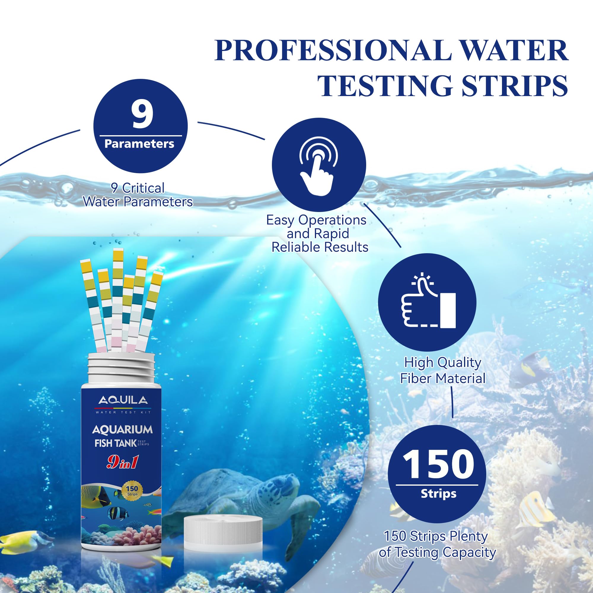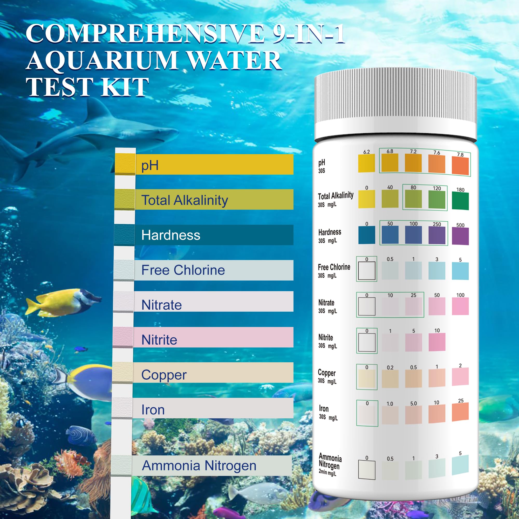 COMPREHENSIVE AQUARIUM WATER TESTING: 9-in-1 water testing strips kit measures pH, total alkalinity, hardness, chlorine, nitrite, sulfate, copper, iron, and ammonia levels in your aquarium water