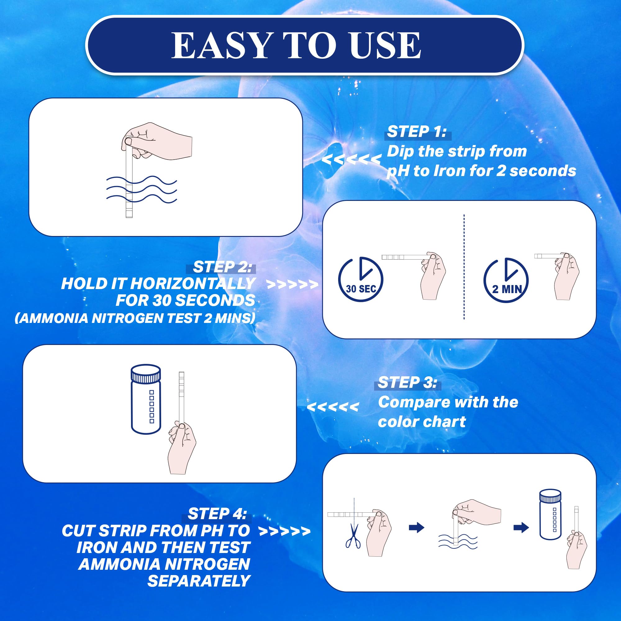 PREMIUM QUALITY AQUARIUM TEST KIT: Crafted from high quality fiber, these ammonia test strips for fish tank provide precise, reliable results for each element without color bleeding