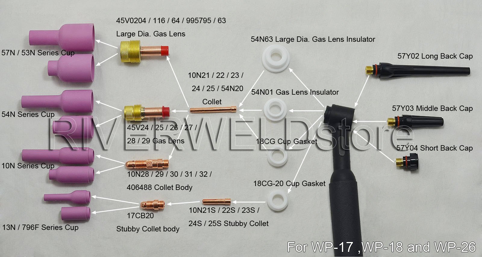 This kit fits all 17 & 26 series air cooled torches and 18 series water cooled torches, including the Lincoln PTA-17, PTA-18 and PTA-26 torches, Miller Diamondback DB17,DB18 and DB 26 torches, along with the Weld craft WP-17, WP-18 and WP-26 torches.