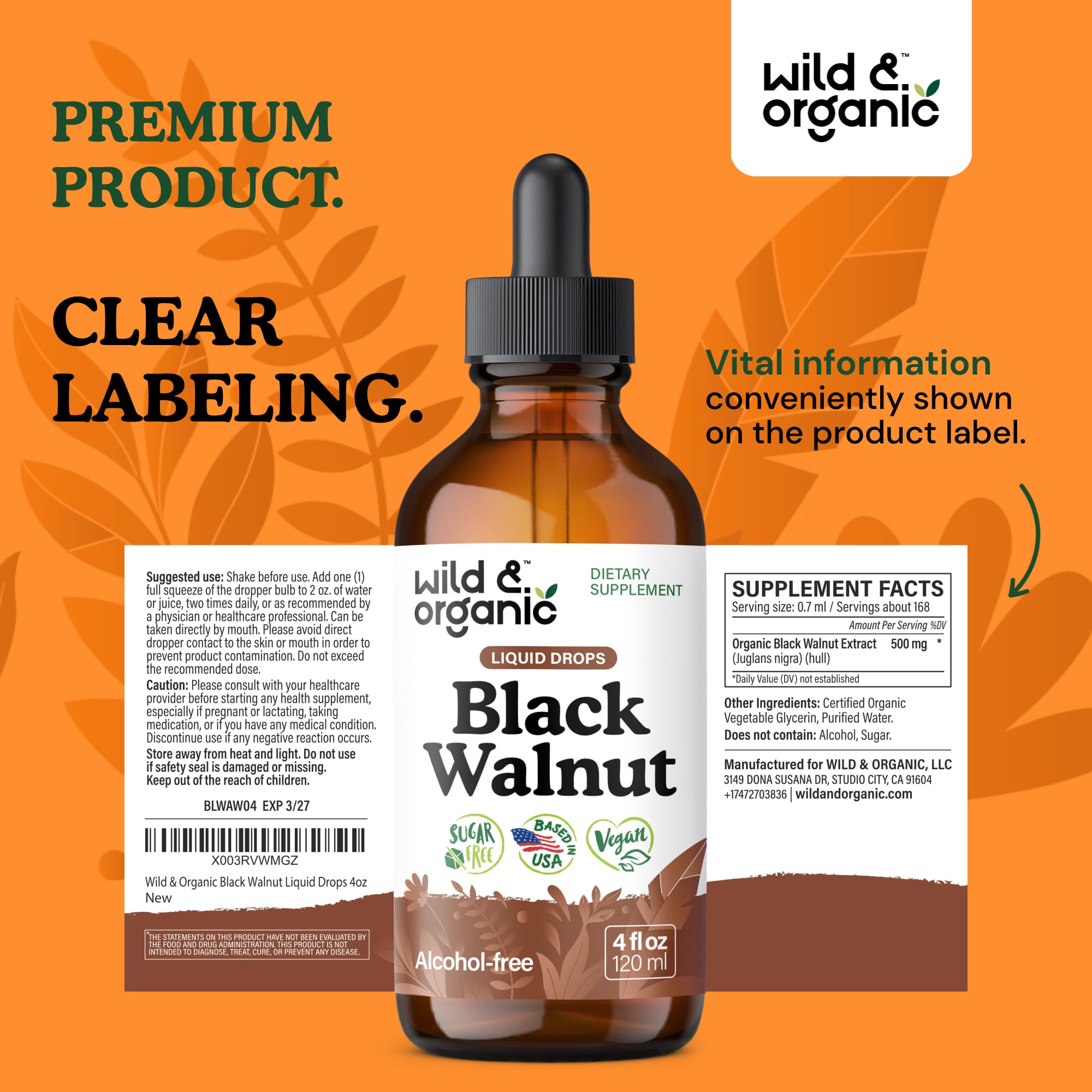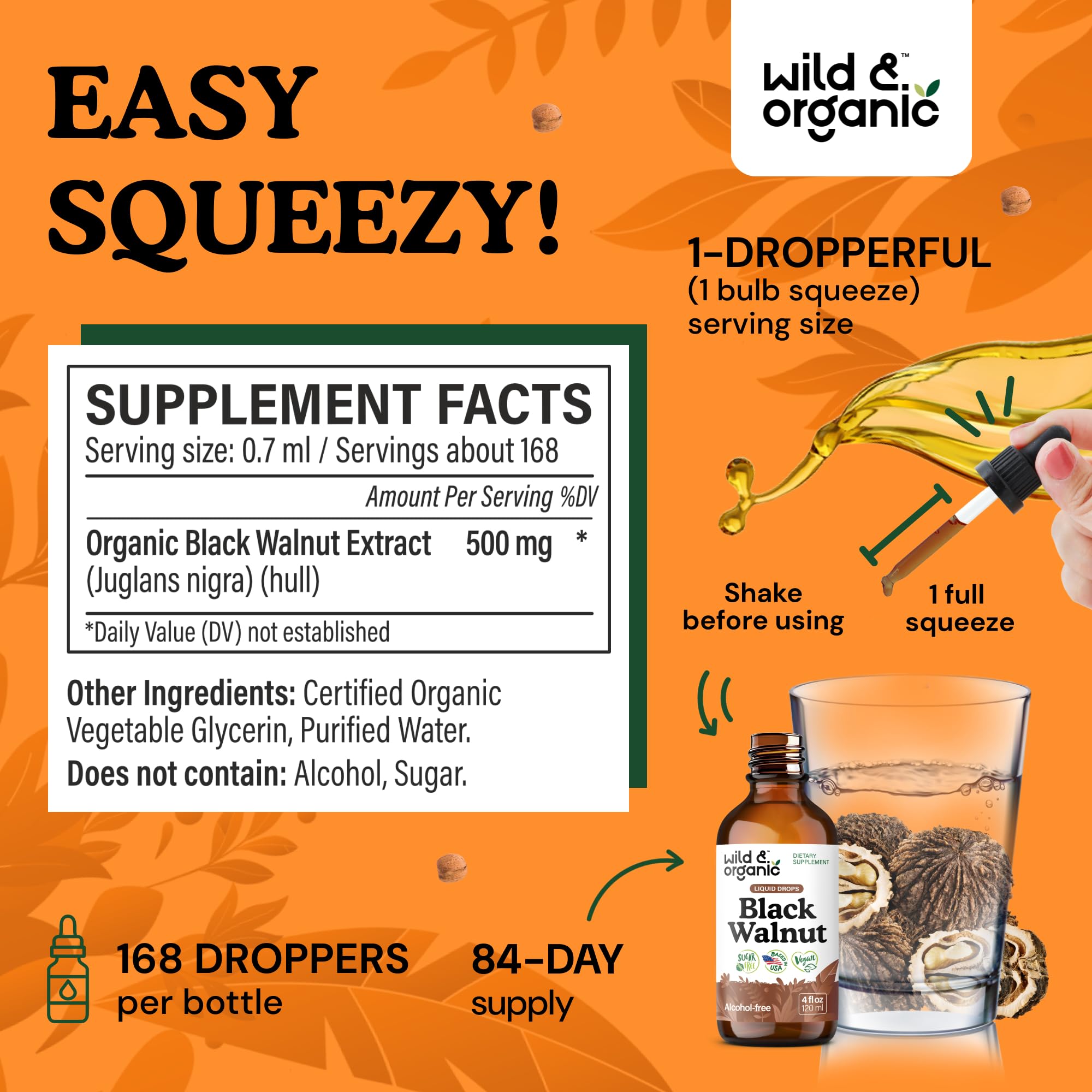 84-Day Supply: Each 4 fl. oz. bottle of Wild & Organic black walnut herb drops contains 168 servings per bottle, providing an 84-day supply when taken two times per day.