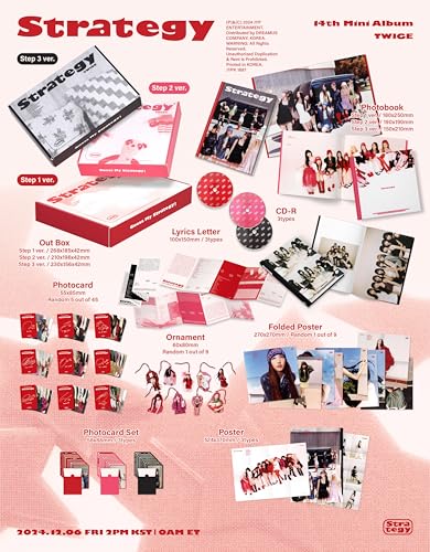Continuing to break records globally, TWICE is back with their newest and latest 14th Mini Album titled 'STRATEGY' - available in 3 versions: Step 1 ver., Step 2 ver., and Step 3 ver. Contents of the album include: CD, Photo Book (88 pages), Photo Card (random 5 of 45), Folded Poster (random 1 of 9), Ornament (random 1 of 9), Lyrics Letter and Photo Card Set. US/EU Exclusive: Poster. Dimensions: 185 x 268 x 42 mm (Step 1 ver.) / 196 x 210 x 42 mm (Step 2 ver.) / 156 x 230 x 42 mm (Step 3 ver.).