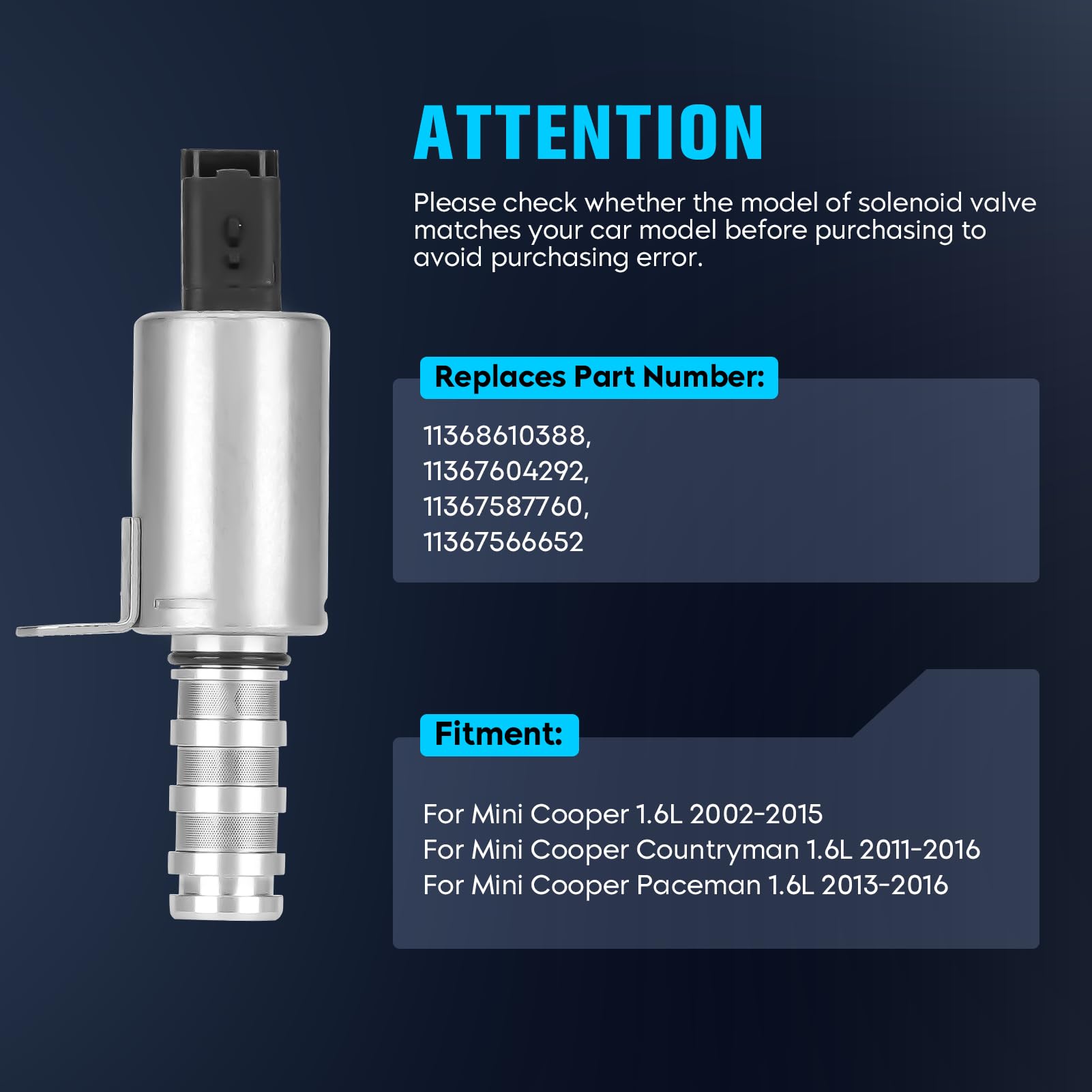 Fitment:Oil Control VVT Valve Variable Valve Timing Solenoid Fit For Mini Cooper 1.6L 2002-2015, Mini Cooper Countryman 1.6L 2011-2016, Mini Cooper Paceman 1.6L 2014-2016,etc.