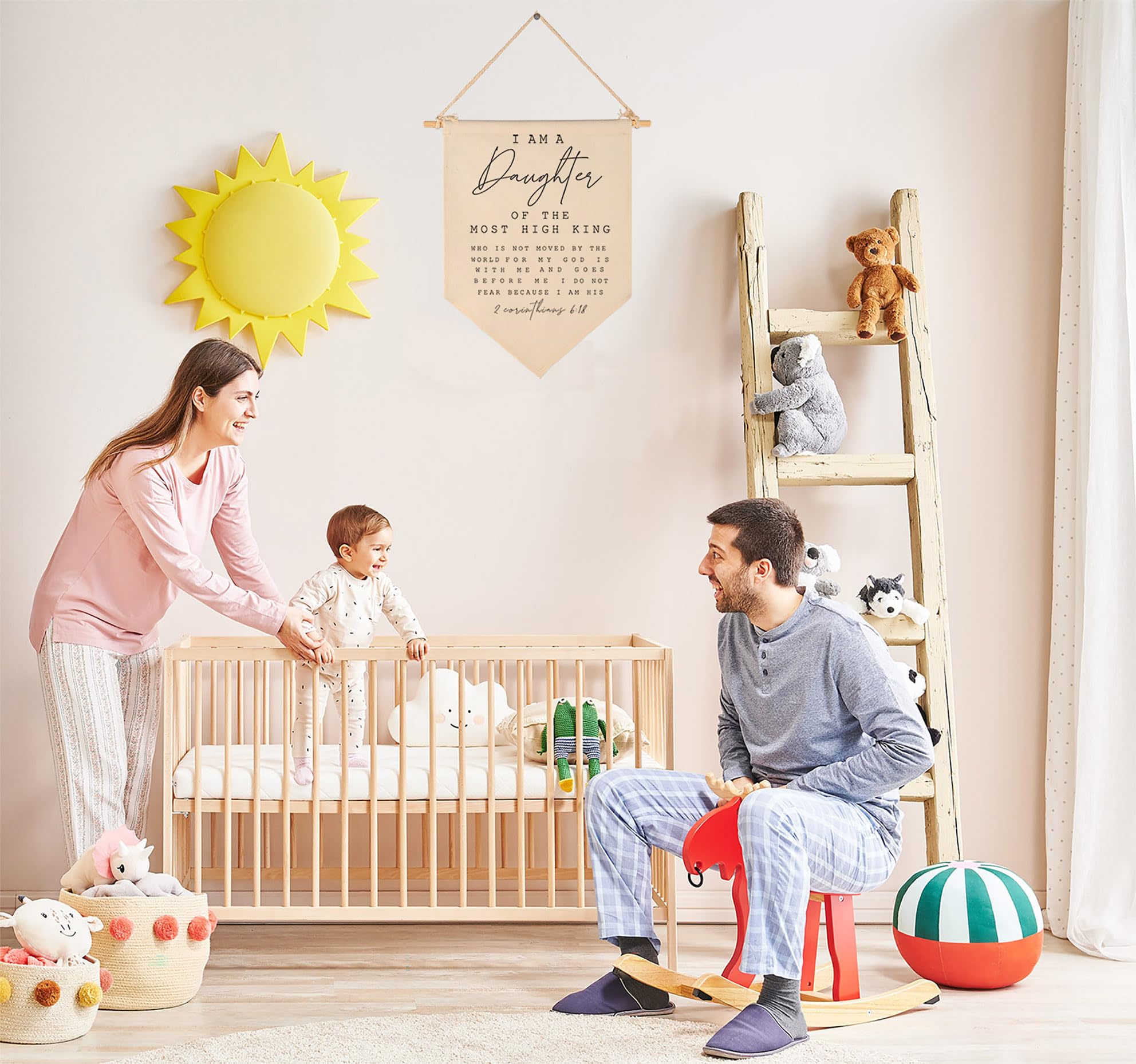 Crafted from natural cotton canvas, this 15.4 x 11 inch nursery wall banner brings a soft and calming touch to baby room, above crib or toddler space. The durable fabric keeps its shape with a natural texture, while the clear print stays bright with everyday use. Lightweight and easy to hang, it comes with a wooden dowel and pre-tied twine for quick setup on walls, doors or shelves. The versatile size fits small spaces without feeling crowded, making it perfect for creating a cozy nursery atmosphere. A thoughtful gift for baby showers, newborn arrival or first birthday.