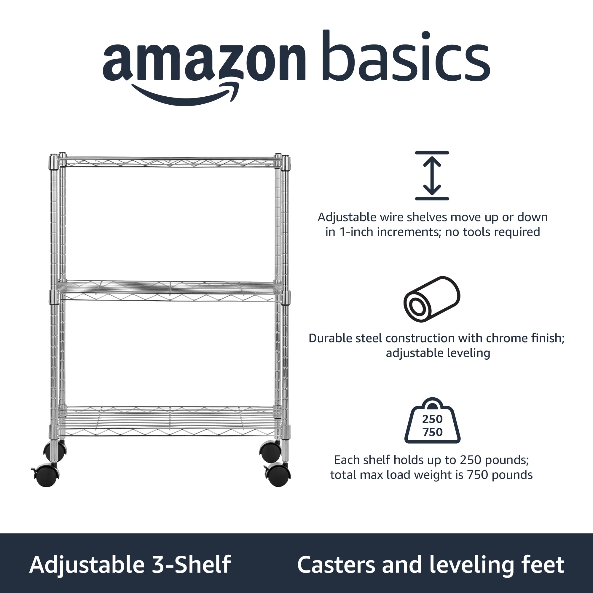 Durable steel construction with a Chrome finish; weight capacity per shelf: 250 pounds with leveling feet, 73 pounds with wheels not in motion, and 50 pounds with wheels in motion; weight capacity overall: 750 pounds with leveling feet, 220 pounds with wheels not in motion, and 150 pounds with wheels in motion (based on evenly distributed weight)