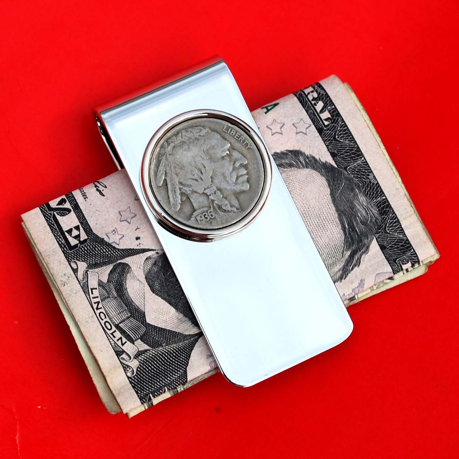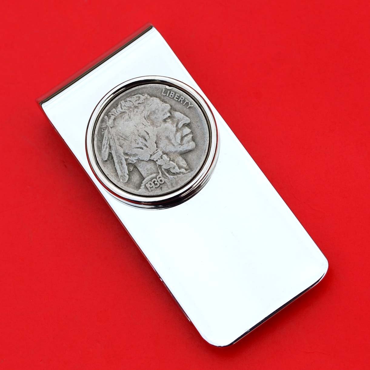 Description You are looking at a gorgeous silver money clip, set with an authentic United States 1936 Indian Head Buffalo Nickel. Let me know if you prefer Buffalo side of coin to show in front. The clip is about 2.36"(60mm) x 1.03"(26mm), made of high quality brass, eco-friendly, high elasticity, mirror polished, can hold the money very tight and secure, silver body with silver coin bezel to hold the coin, brand new and has never been used before. I only use these coins with readable dates, never try to clean them, and always keep their collectible and numismatic values. I hope you end up with one of these beautiful coin money clip. This money clip will be great for holiday gift, investment purpose or just adding to your coin/jewelry collection. I will be happy to combine shipping for multiple items. Thanks!!!