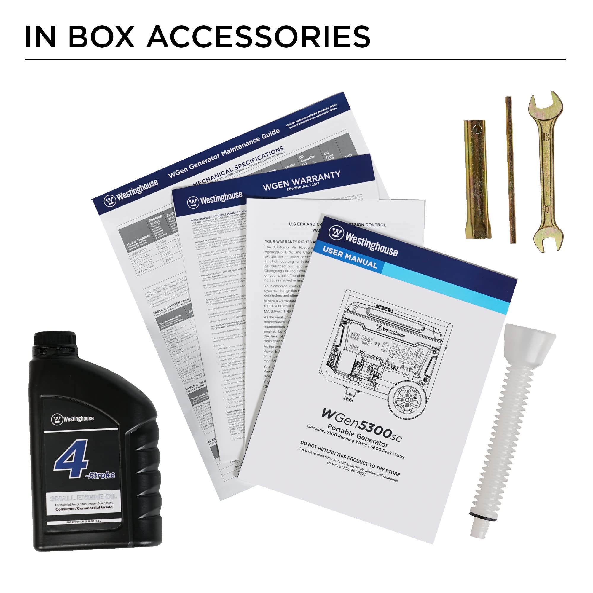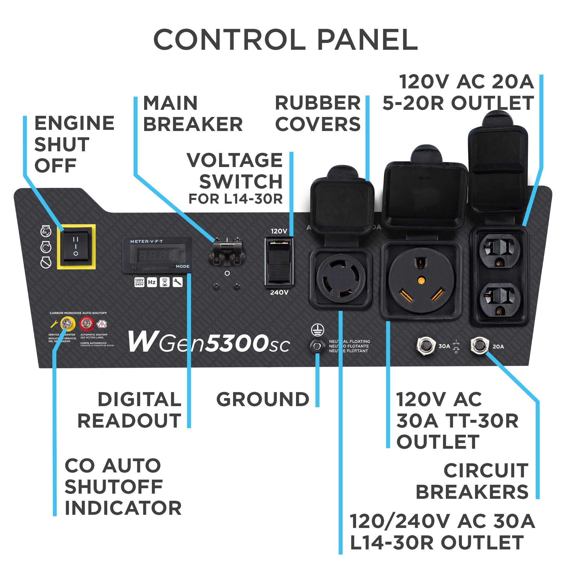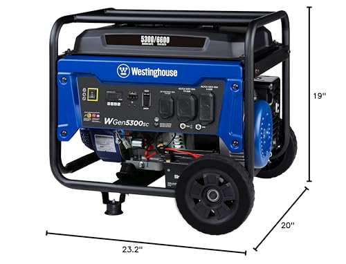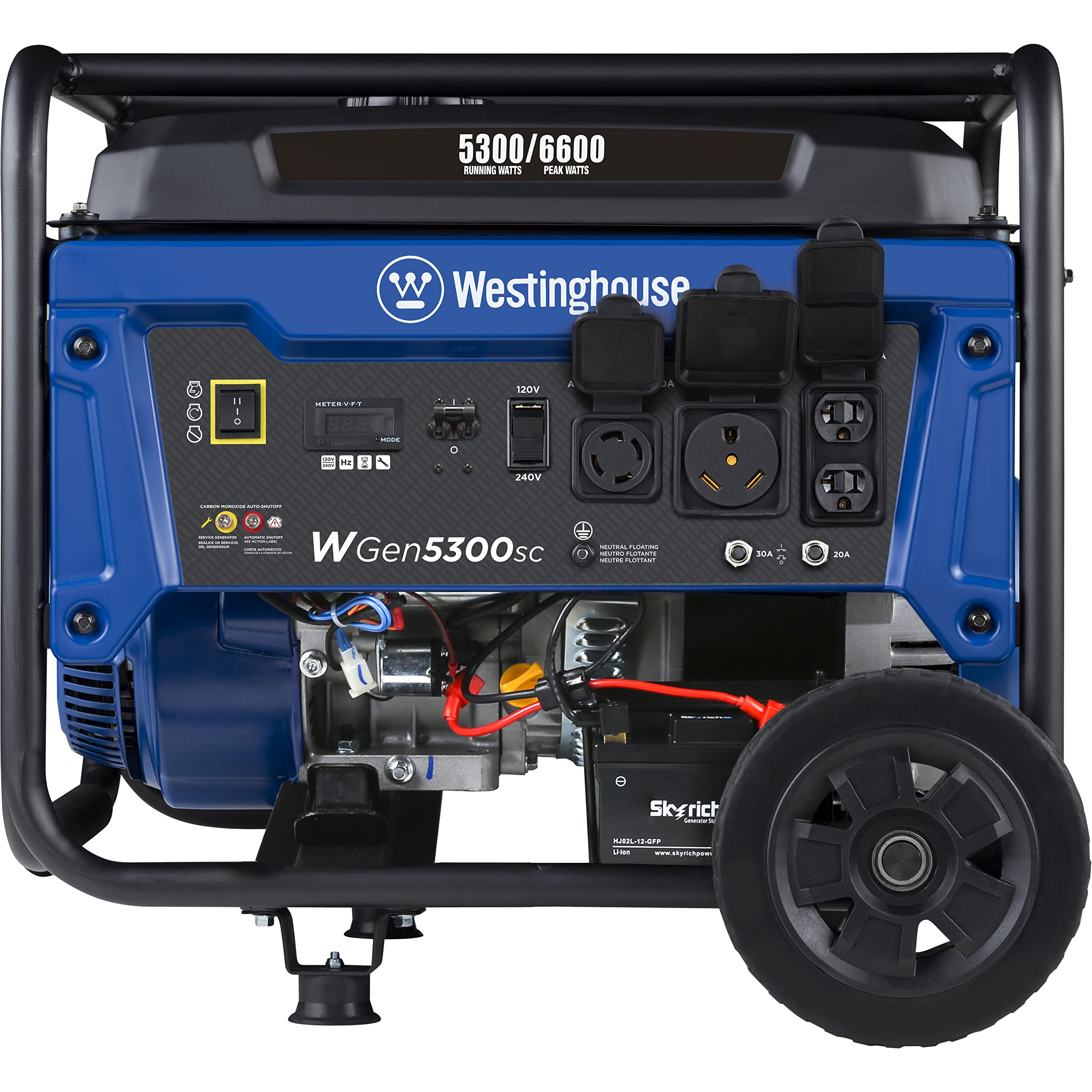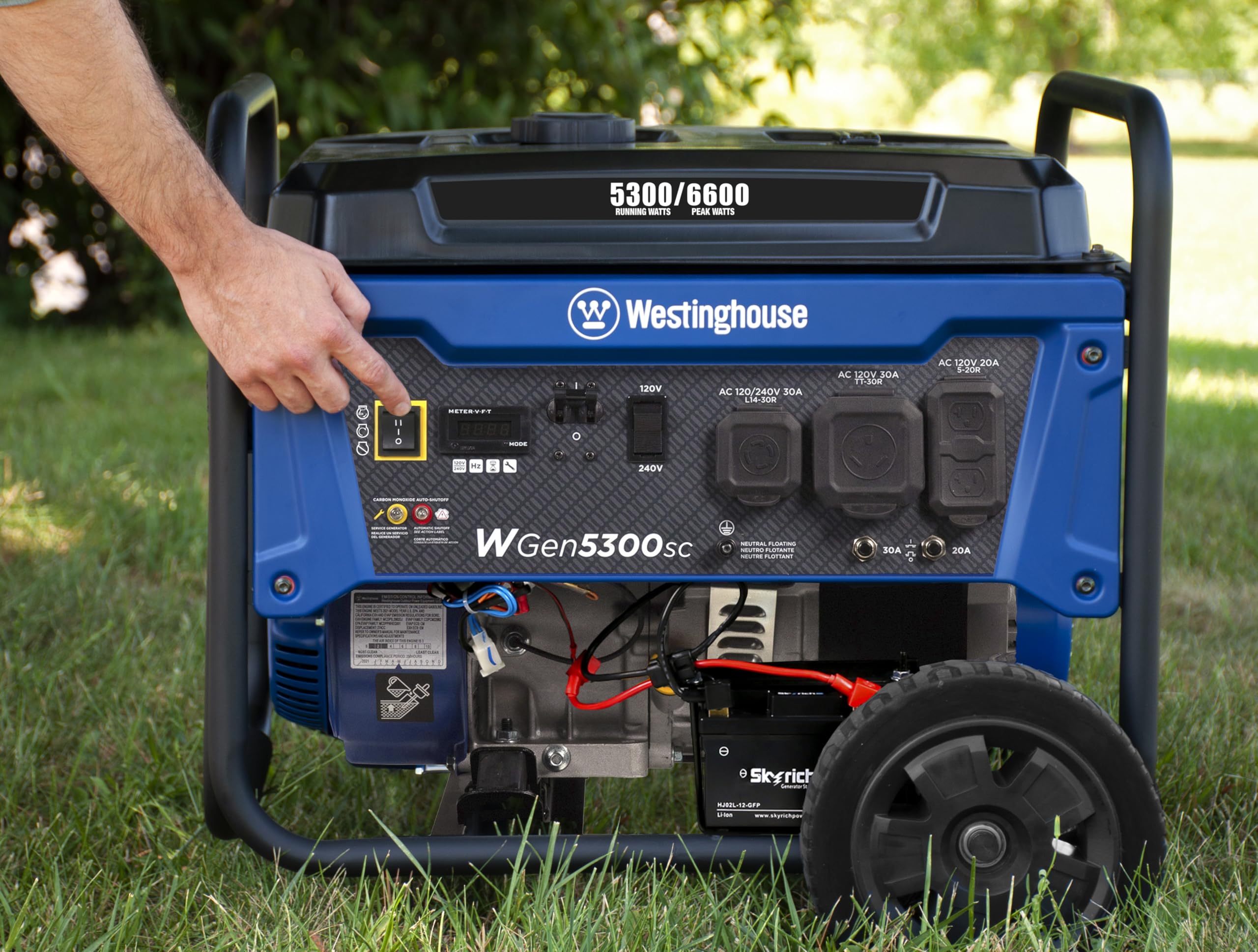 The Westinghouse WGen5300sc is a versatile solution for all your power needs from your home to your travel trailer when you’re looking for a dependable backup power supply. The WGen5300sc produces 6,600 peak watts and 5,300 running watts with a powerful 274cc 4-Stroke OHV Westinghouse Engine constructed for durability. Running for up to 14.5 hours on a 4.7 gal. (18L) tank of gas, it's conveniently equipped with a built-in fuel gauge, automatic low oil shutdown, and electric start with manual choke. The L14-30R 30A outlet is Transfer Switch Ready for total household power and eliminates the hassle for annoying extension cords or power strips. Combined with an RV Ready TT-30R 30A outlet, all this generator needs is a one cord hookup to ensure your recreation vehicle or home is ready to go for air conditioners, refrigerators, sump pumps, and home necessities. The intuitive control panel includes the Digital Readout to share real-time updates on maintenance information, making it easy to care for the WGen5300sc with long life and lasting utility. Engineered into a compact hardened-steel frame with added roll bars, foam grip handle, and never-flat wheels, it lets you easily move this generator from storage to use. The WGen5300sc Portable Generator is complete with a 3-Year Limited Warranty and Lifetime Technical Support to ensure your confidence can be backed by our nationwide customer service and support network.