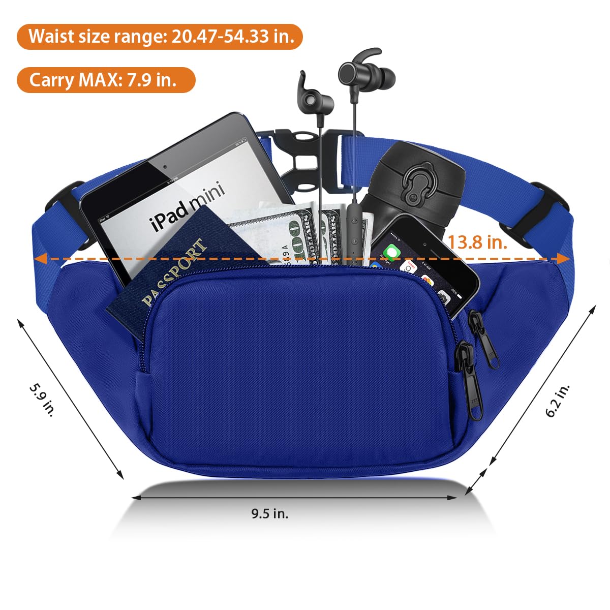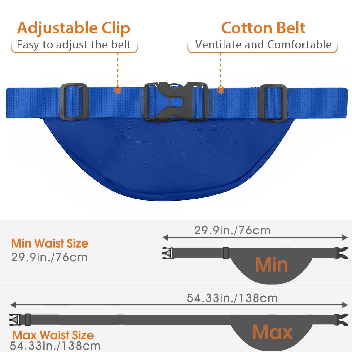 【Adjustable large capacity fanny pack with extended belt packed in the front pocket】This cool Waist Bag Pack for women men can be adjust widely with waist range from 52cm to 138cm(20.47-54.33 Inches),easy to adjust the length of Belt bag as your request by the quick release buckle,you can wear this fanny pack in front of your waist,back on your hip,over the shoulder or under your arm.