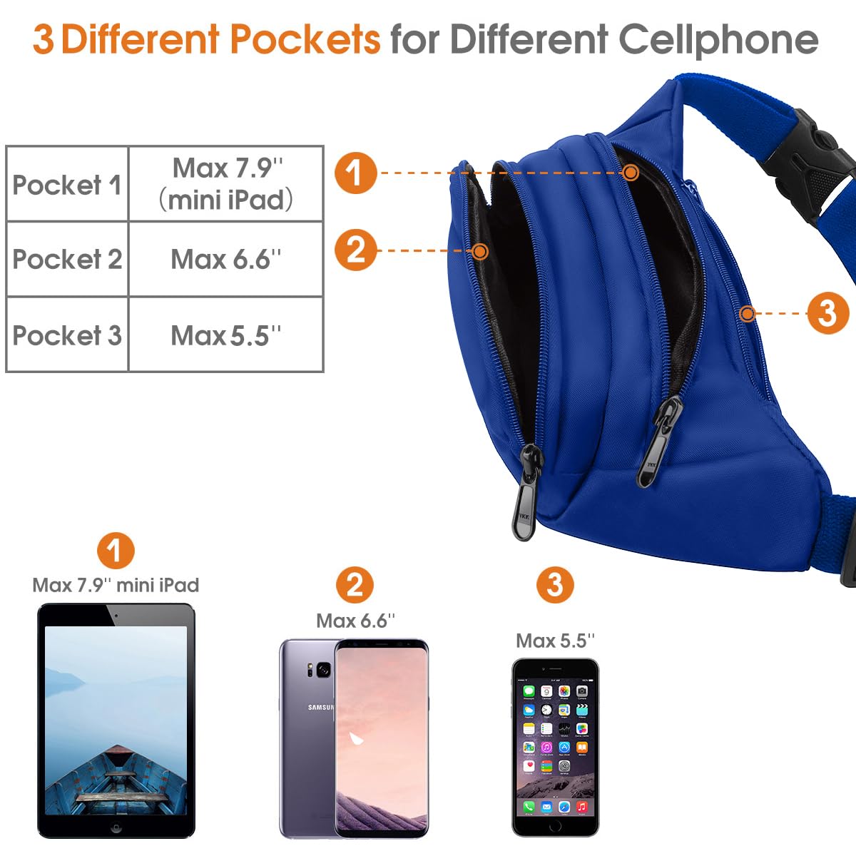 【Large Crossbody Fanny Pack for Women Men】3 pockets waist bag pack:big enough to carry MAX 7.9''iPad or 6.6''cellphone like iPhone X/8/7/6S Plus or Galaxy S9/8/7/6,cards, single keys,or hold a 500ml water bottle while running,working,travelling,workout or dog walking.Hands-Free and enjoy a better festival time.