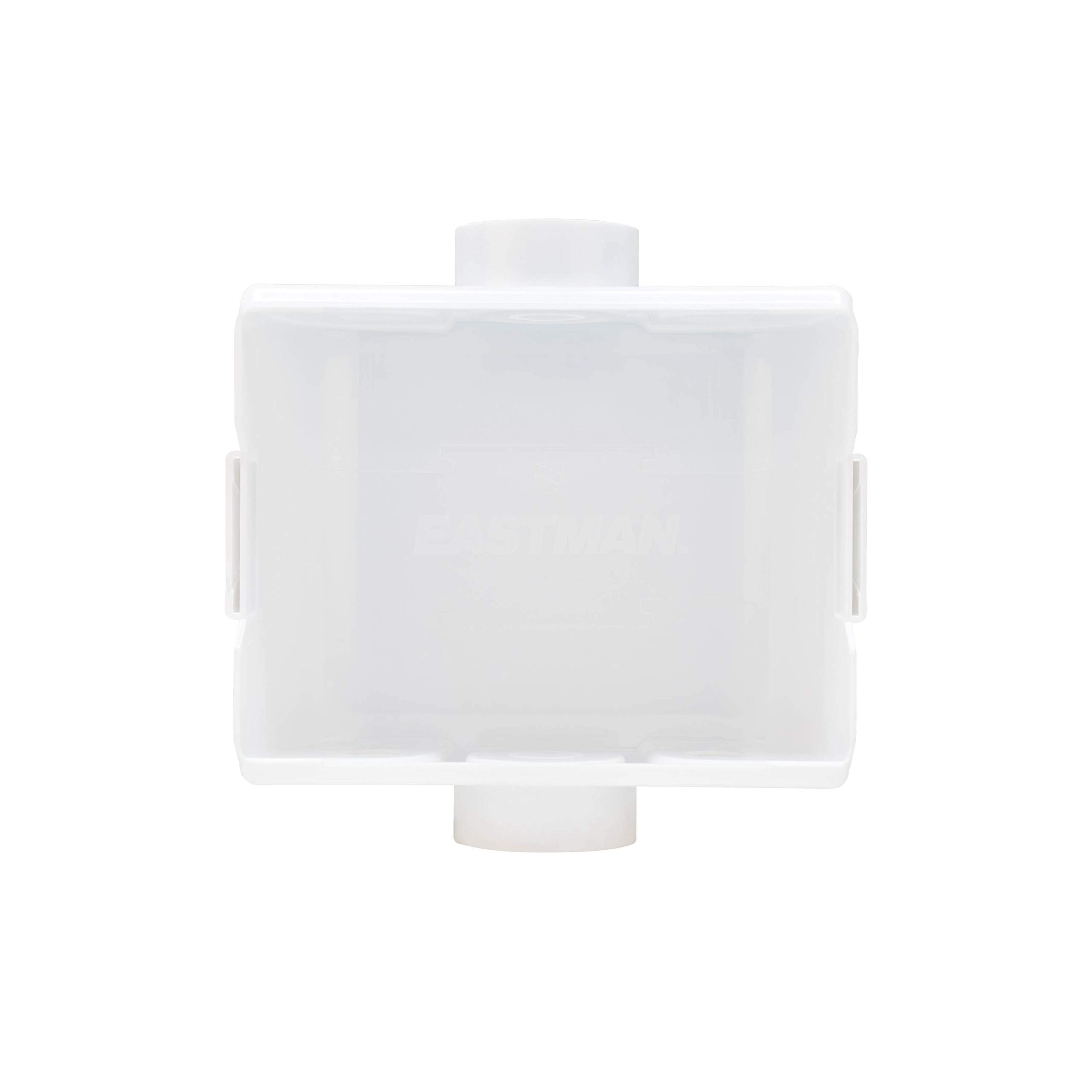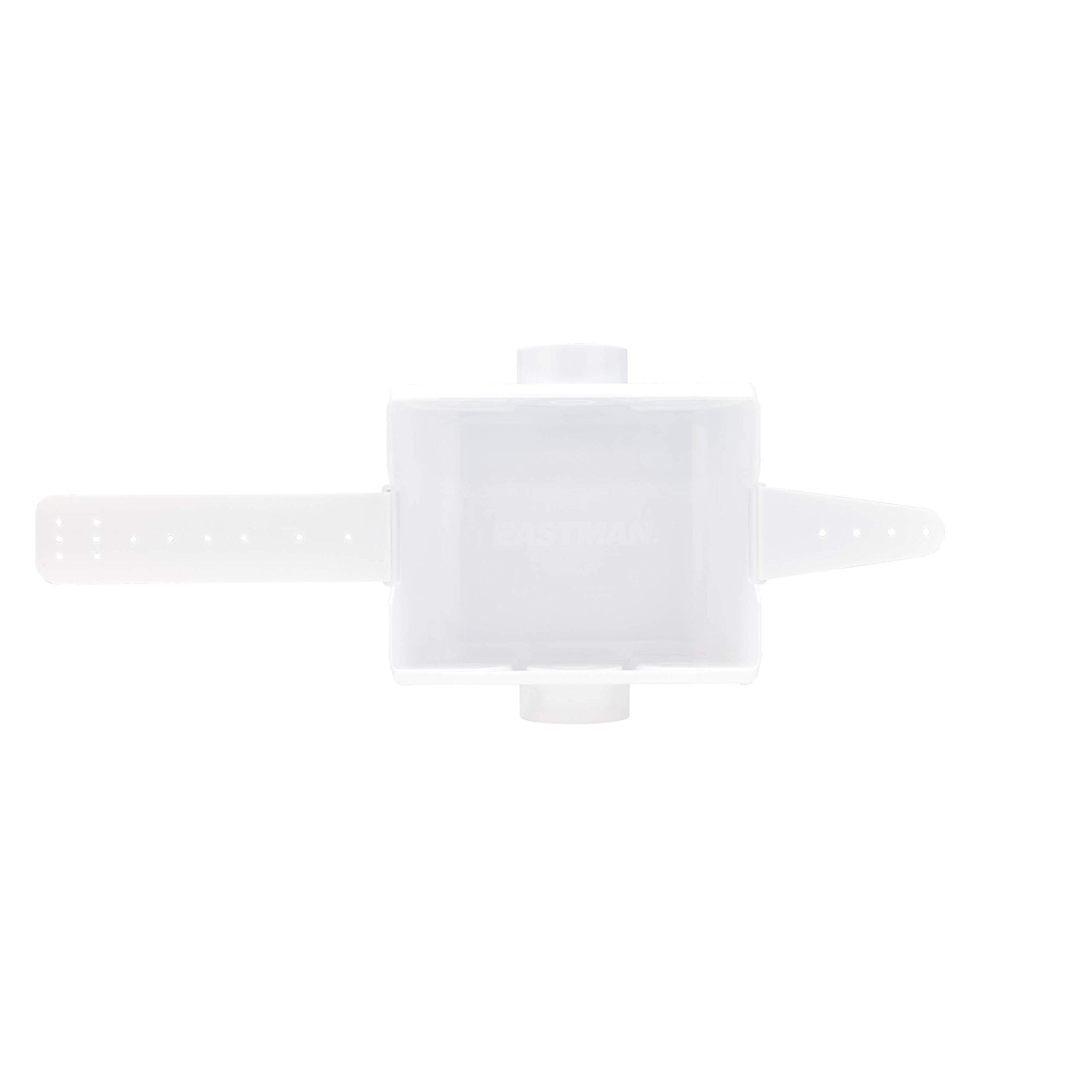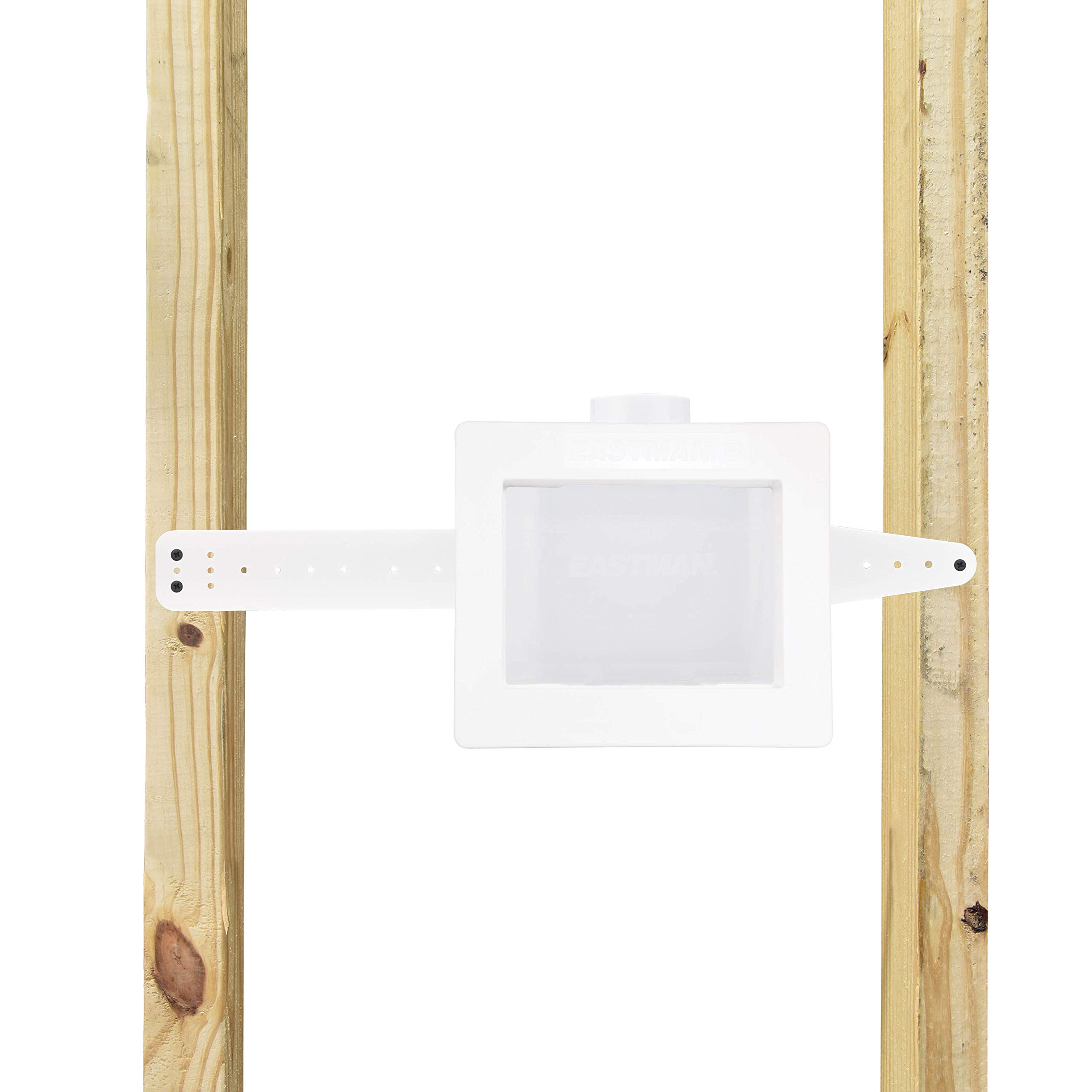 Simplify your plumbing projects with the Eastman washer water supply box. Composed of strong and sturdy white heavy duty plastic, this laundry outlet box is corrosion resistant, UPC approved, and features a one-piece construction which provides recessed protection from potential leaks with a raised drip guard. This washing machine supply box is designed for recessed residential applications, and includes a snap-on face plate cover which accommodates up to a 1 inch sheetrock.