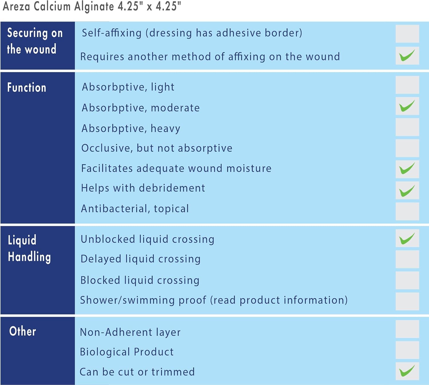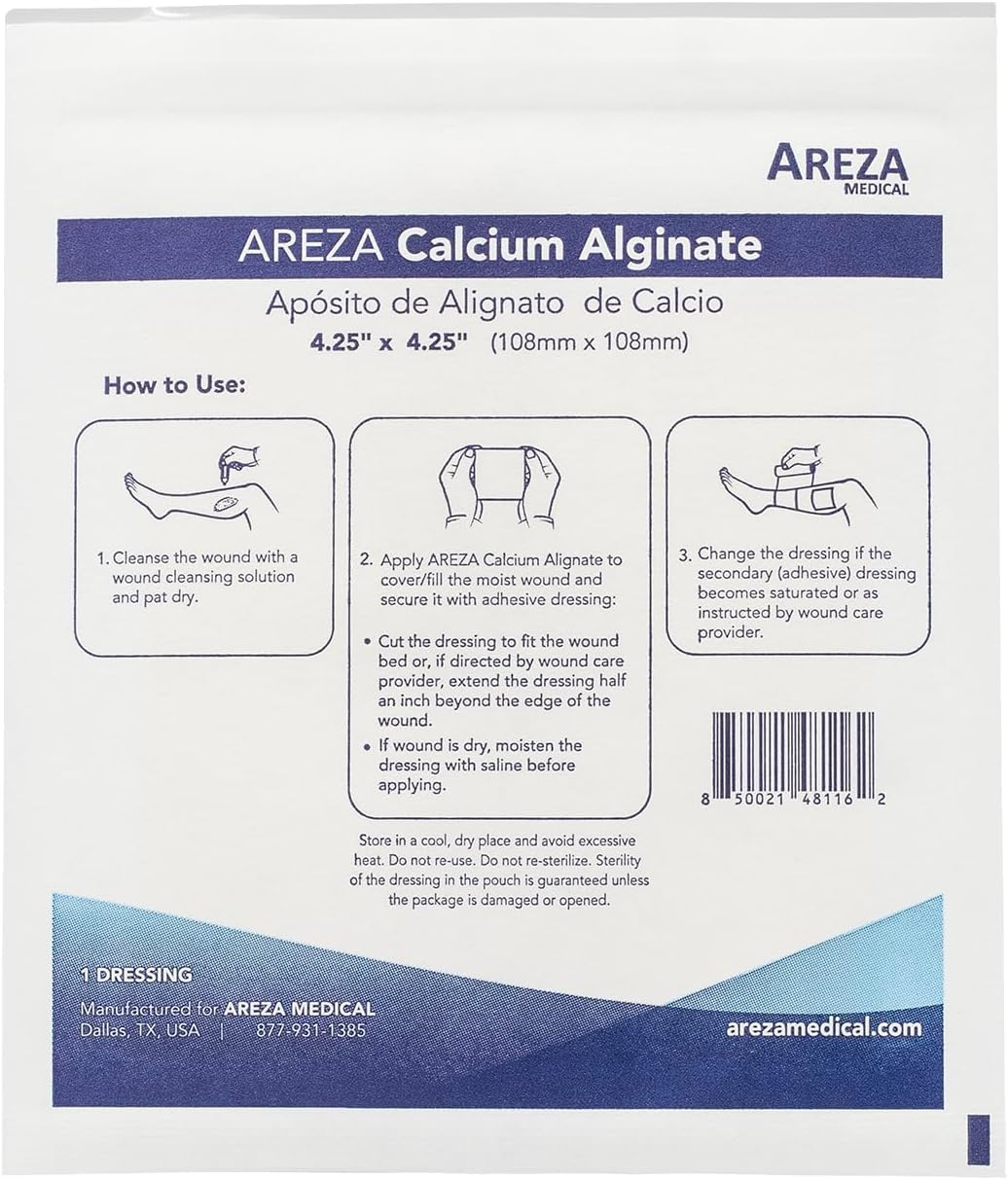 🩹 VERSATILE FOR MANY WOUND TYPES: Areza Calcium Alginate Dressing (4.25″ × 4.25″) is ideal for wounds with moderate to heavy discharge such as diabetic ulcers, venous ulcers, and post-surgical wounds. Easy to use and can be cut to fit any wound size. For dry wounds, moisten before use. After placement, secure with gauze, gauze rolls, tubular, or secondary dressing. Perfect for first aid kits and everyday wound care.