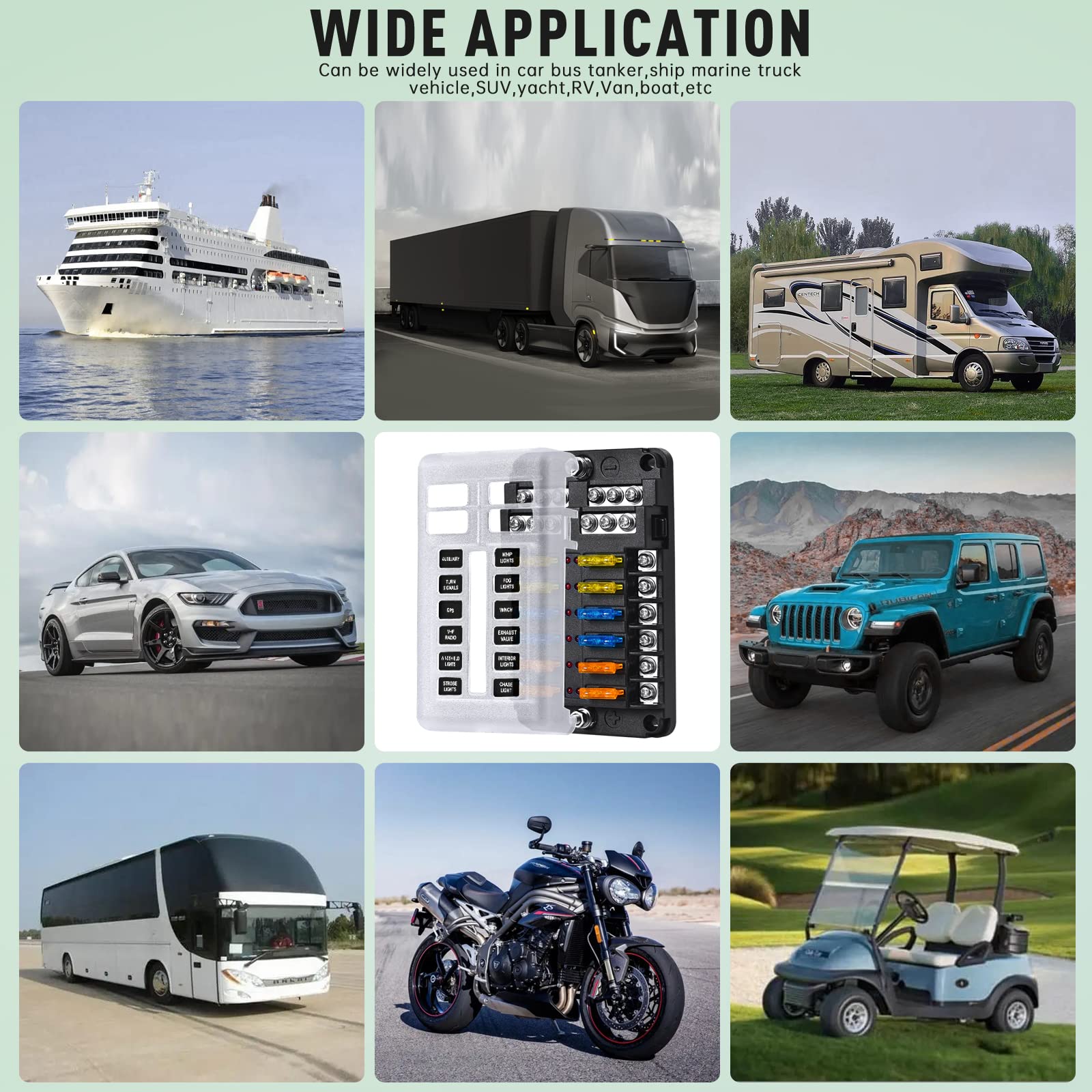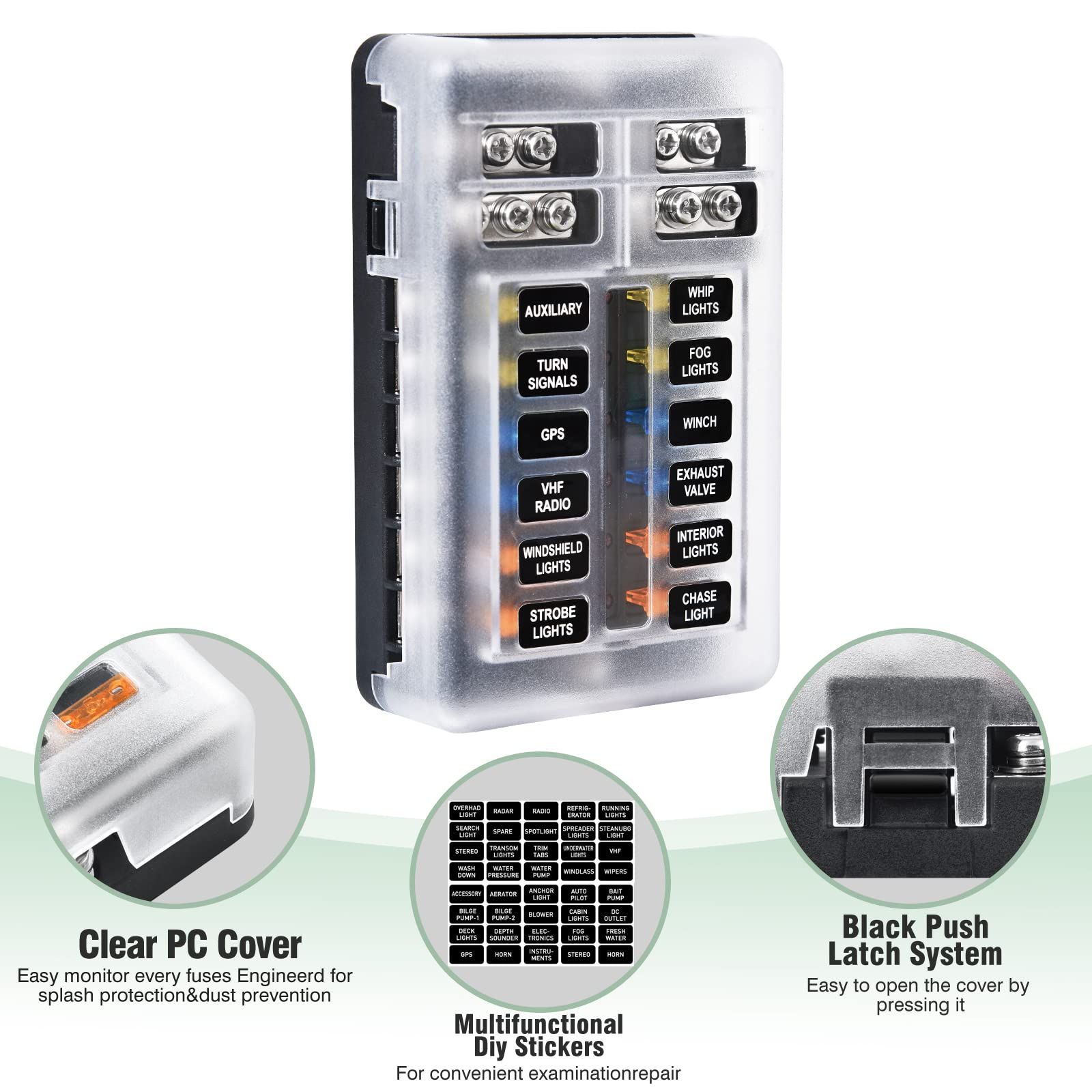 Free Blade Fuses: This 12-Circuit Blade Fuse Block widely used in Cars, Buses, Tankers, Boat, Marine, Truck, SUV, Yacht, RV, Ships etc. The package includes 1 x 12V 12-way fuse block,24 x blade type fuse,4 x screws, 2 x tip stickers