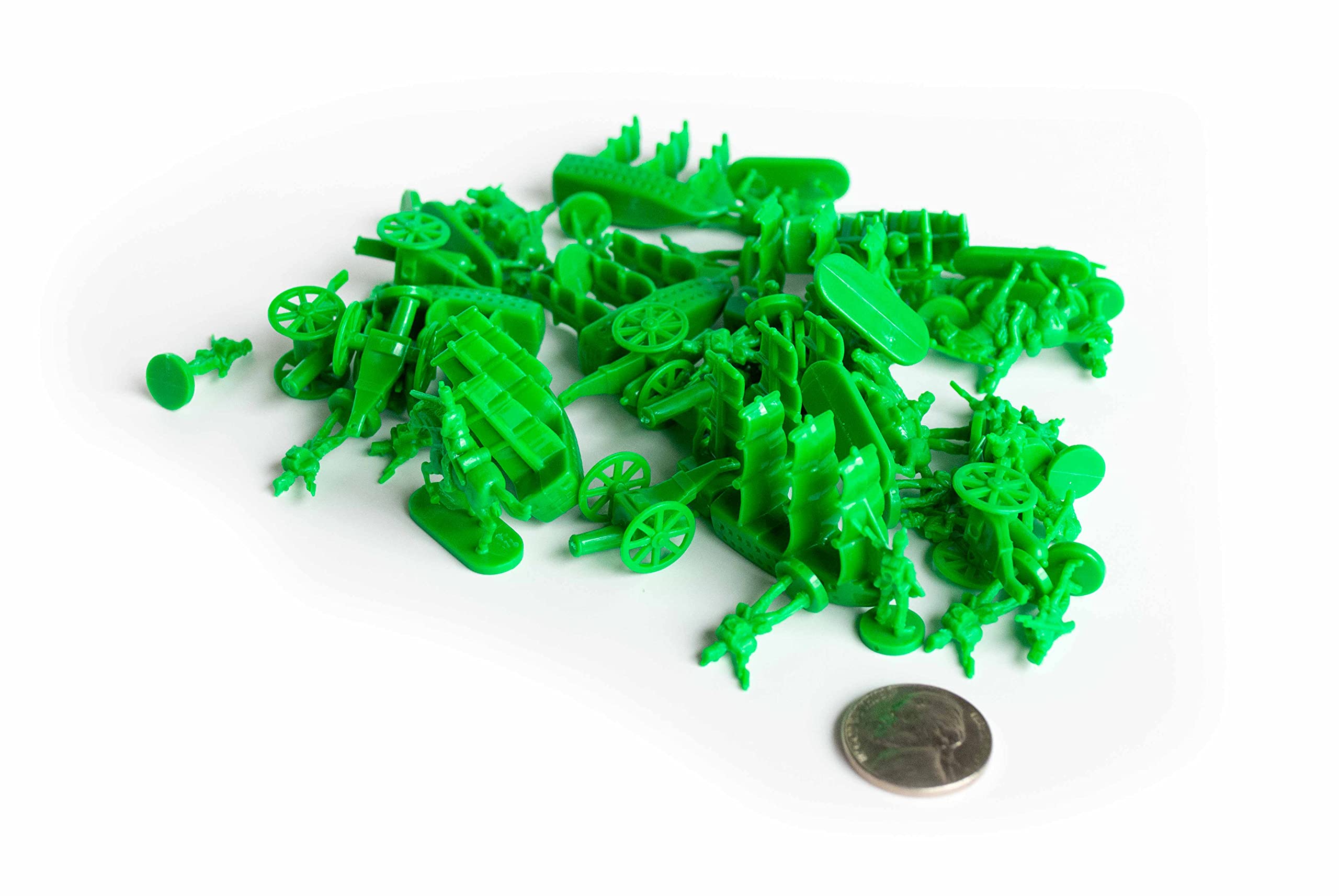 Contains 24 infantry, 8 artillery, 8 cavalry, and 8 ships; 48 military pieces total. High quality green plastic, with realistic detail on toy soldiers. These miniatures are also used in the board game, VIKTORY II. Unit Dimensions: Artillery 28mm in length; Cavalry 32mm in length; Ships 38mm in length; Infantry 21mm in height