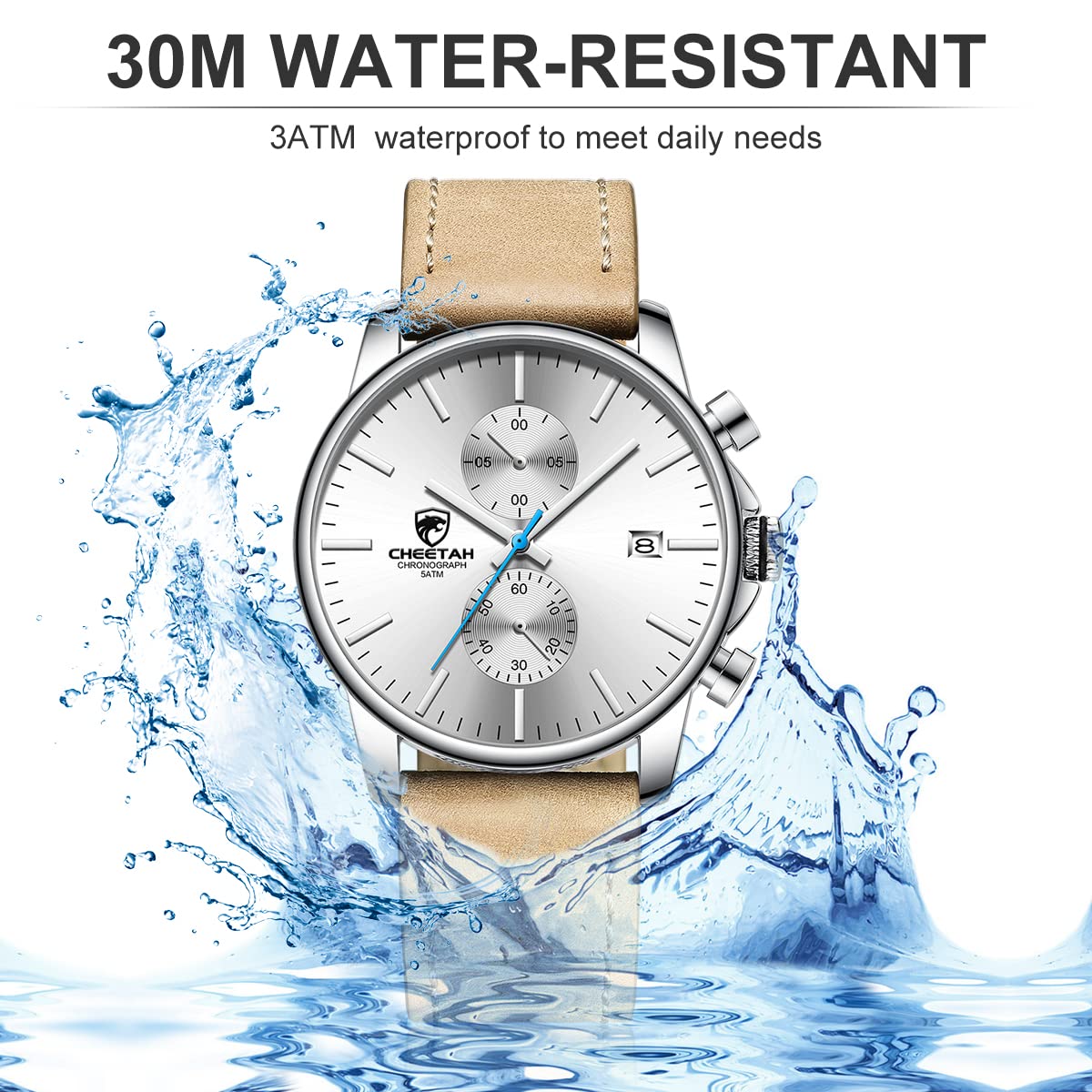 ⌚3ATM waterproof: This watch is waterproof 30m, can withstand daily splash or short immersion in water, but not swimming and showering, diving or snorkeling.