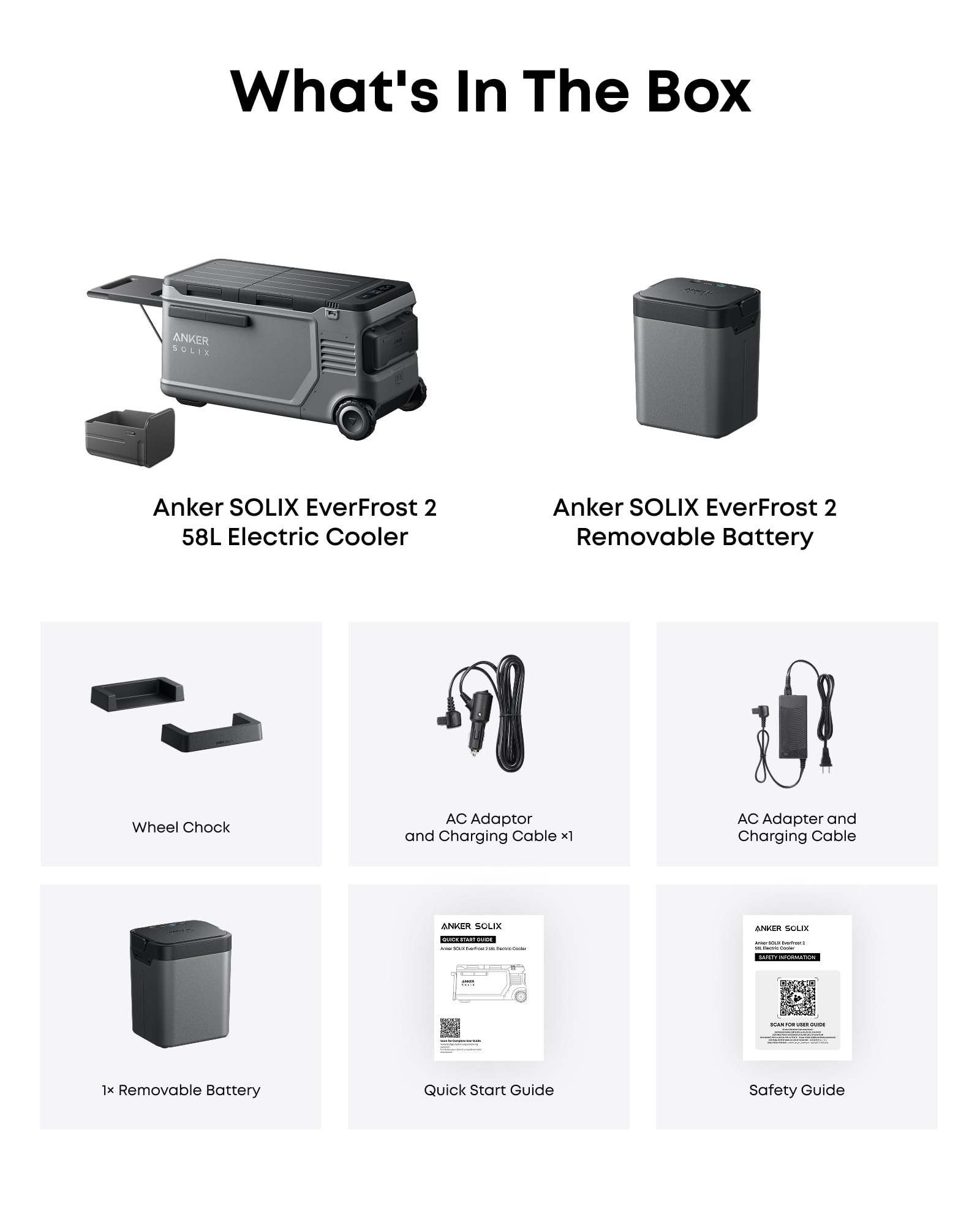 What's in the Box: Anker SOLIX EverFrost 2 Cooler, 2× Removable Batteries, AC Adapter and Charging Cable, Car Charging Cable, Accessory Container, Wheel Chock, Safety, and Quick Start Guide.