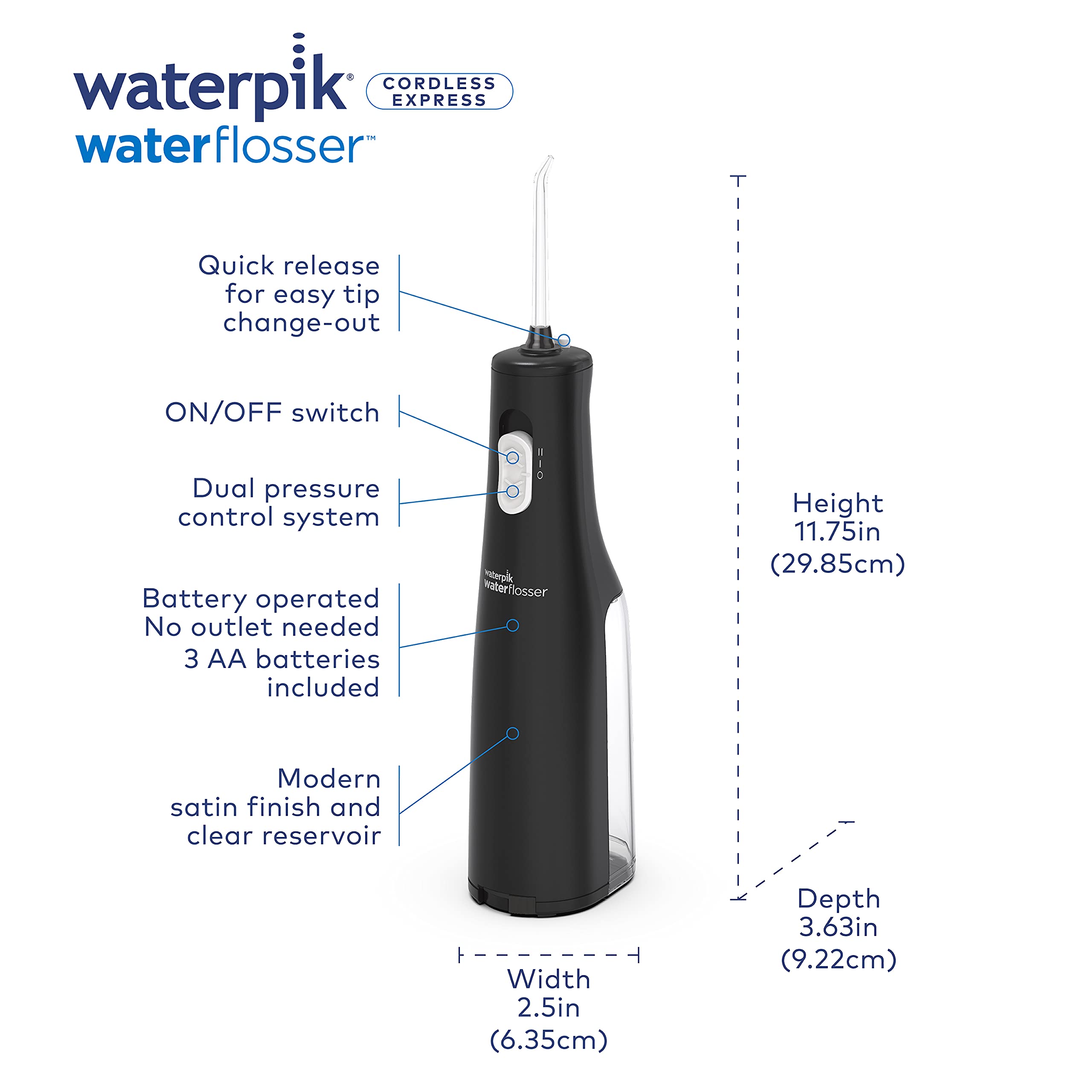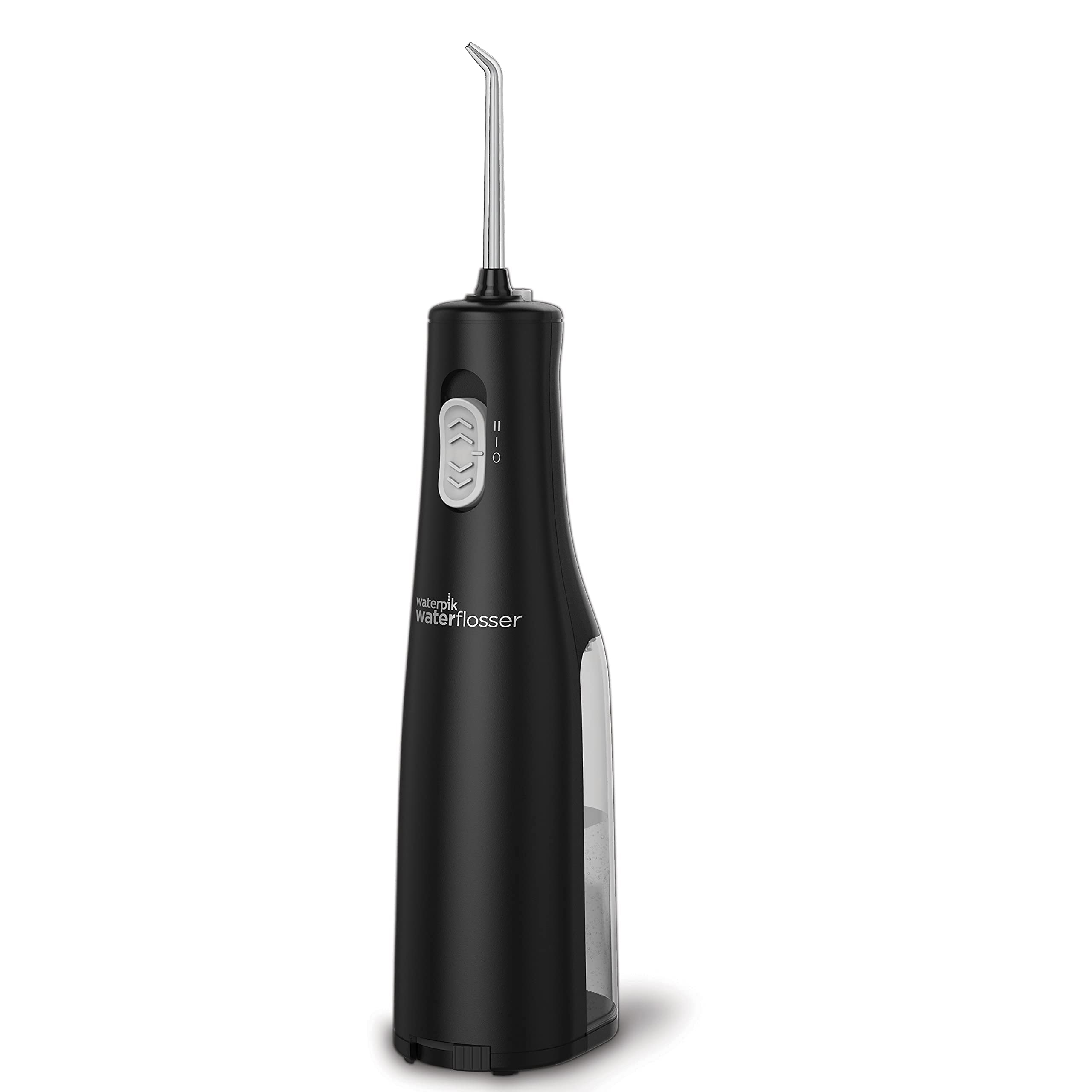Battery operated and waterproof, the Waterpik Cordless Express water flosser is perfect for smaller bathrooms and travel, or when you want the convenience of water flossing in the shower. It combines water pressure with pulsating action for an exceptional cleaning, removing harmful bacteria and debris that traditional brushing and flossing can't reach. This lightweight, portable water flosser comes with 2 classic handheld flossing tips, a water on/off slider switch with 2 pressure settings, 3 replaceable AA batteries, and an easy-to-fill, removable 5-ounce water reservoir with up to 30 seconds of flossing time. The Waterpik Cordless Express water flosser removes up to 99.9% of plaque bacteria that causes gingivitis, cavities, and bad breath from treated areas and is clinically proven up to 2X as effective as string floss for removing bacterial plaque and improving gum health. Waterpik is the #1 water flosser brand recommended by dental professionals, and the Waterpik Cordless Express water flosser is accepted by the American Dental Association (ADA) for safety and effectiveness. Backed by a 1-year manufacturer's limited warranty, see product manual for details.