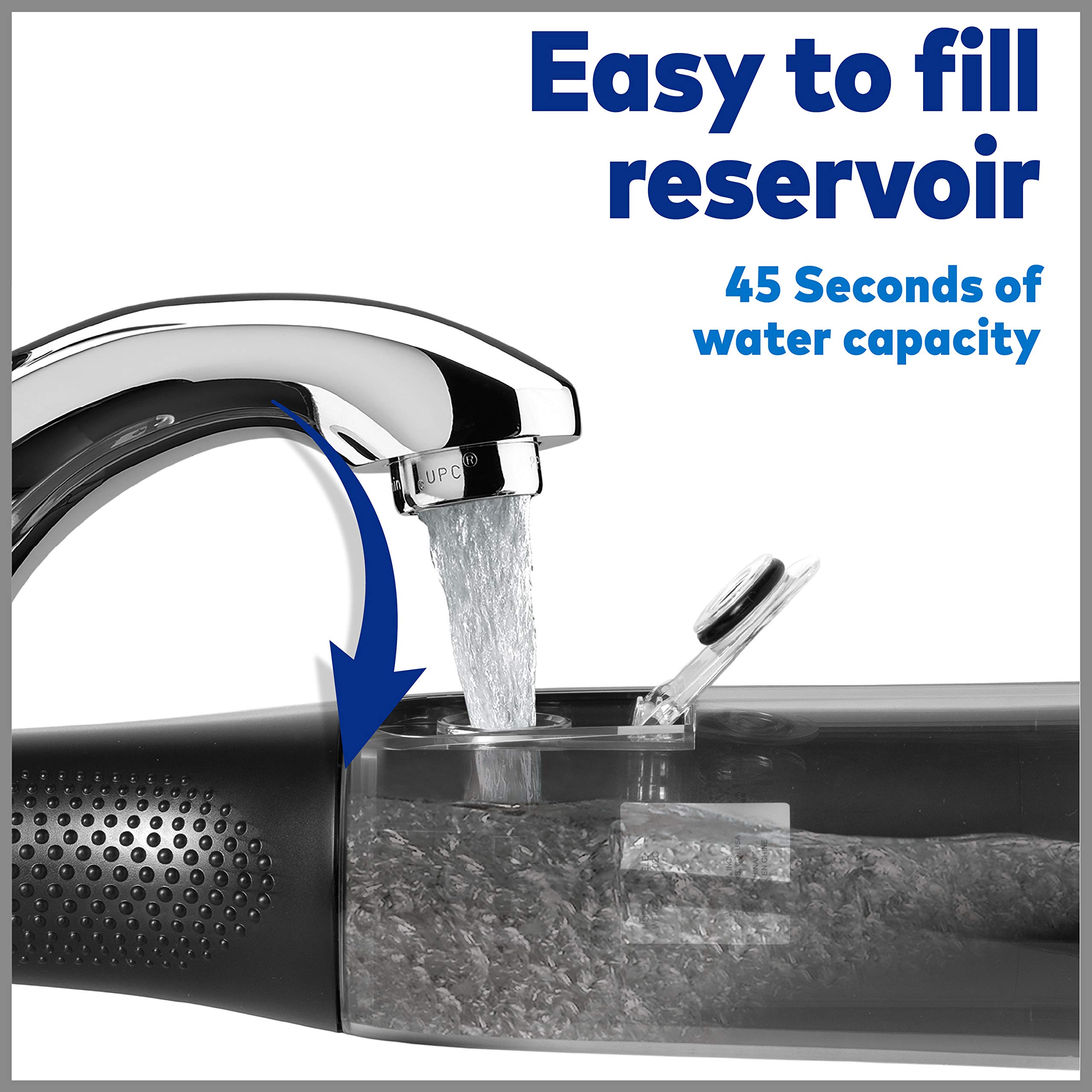 KEY FEATURES: 2 flossing tips, 2 pressure settings, removable 5 oz reservoir (top-rack dishwasher safe for easy cleaning), up to 30 seconds of flossing time, 3 AA replaceable batteries, waterproof for shower use.