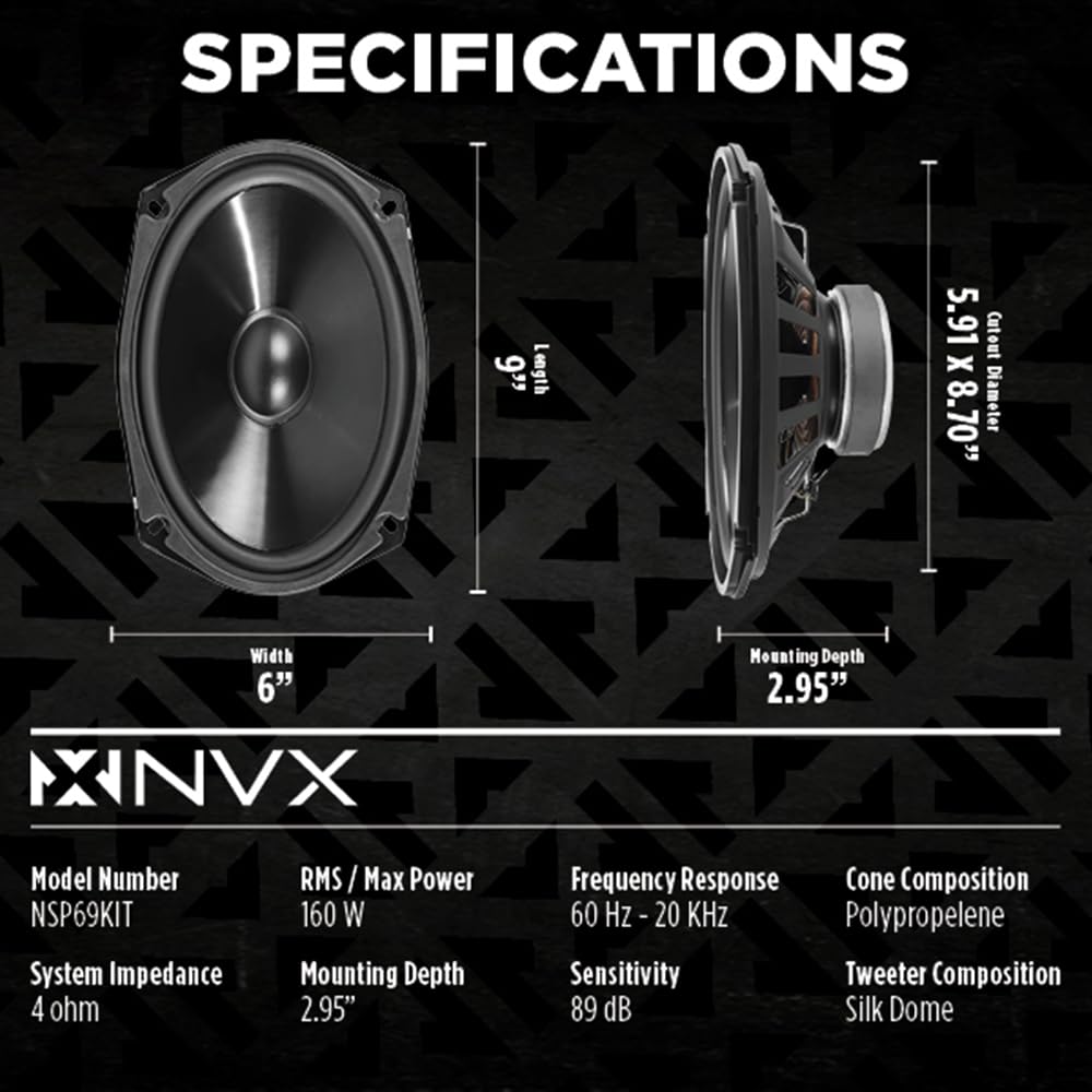 🔊 𝐒𝐮𝐩𝐞𝐫𝐢𝐨𝐫 𝐒𝐨𝐮𝐧𝐝 𝐐𝐮𝐚𝐥𝐢𝐭𝐲: Immerse yourself in high-fidelity audio with the NVX NSP69KIT 6x9" N-Series 2-Way Component System Car Speakers, boasting silk dome tweeters that deliver crisp and detailed sound reproduction.