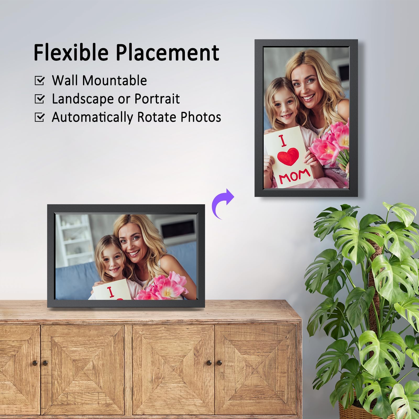 【Wall-Mounted & Auto-Rotate】: With the auto-rotate feature and mounting hole design, Sammix digital picture frames can automatically rotate photos to get a perfect visual, no matter you place it in either portrait or landscape mode,put it on table or hang it on wall. The electronic picture frame has a wide variety of customizable settings, such as withdraw photo, favorite photo, single repeat, hide/show picture and caption, sleep mode, weather, clock, and more.