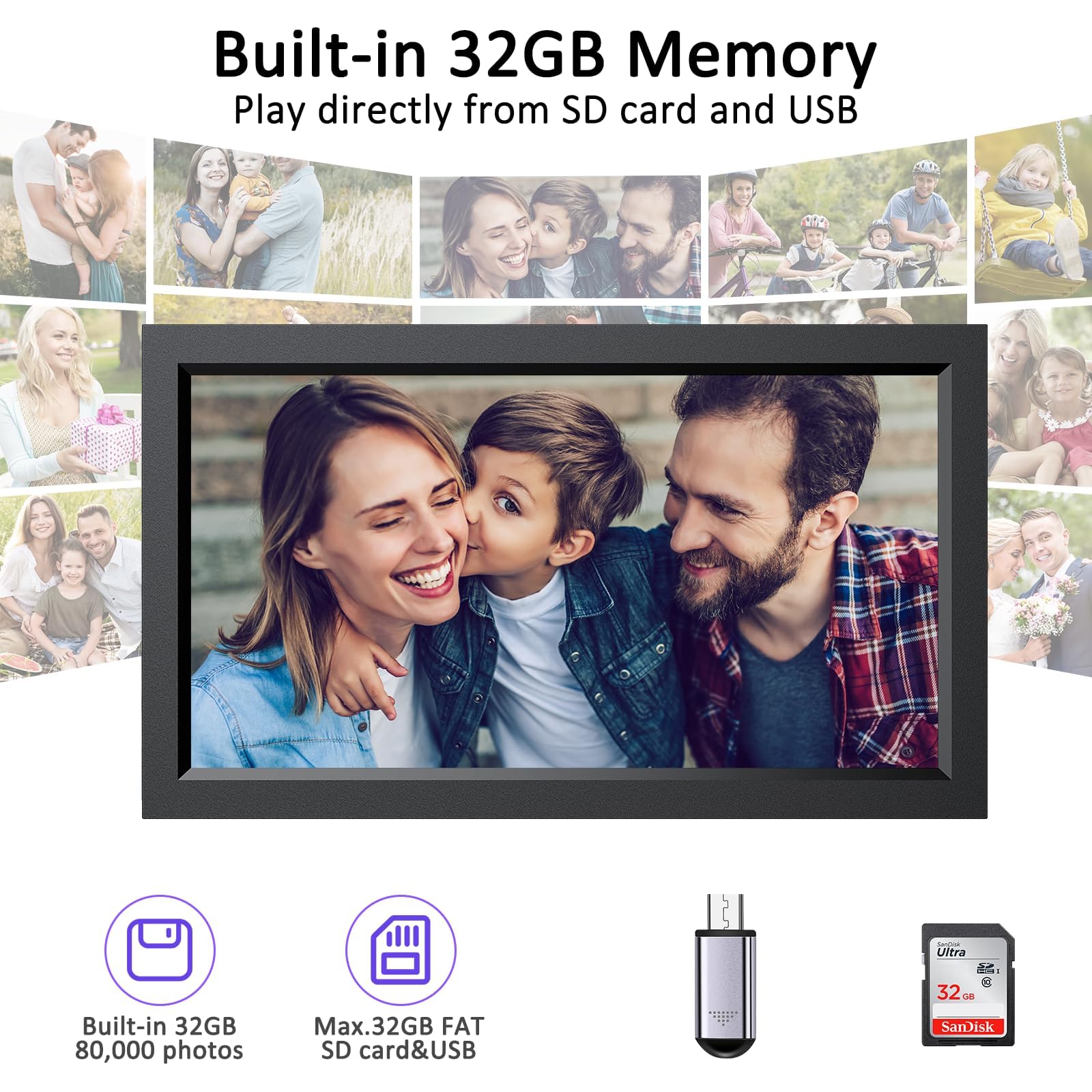【Large 32GB Storage & Batch Upload】: Built-in 32GB storage with SD card and USB drive slot can easily store 88,000+photos(300KB/pc) with ZERO subscription fees. You can upload 100 photos each time via phone App or 500 photos via Web App. You can also play directly from external storage devices(FAT 32 max.32GB), or import/export/backup photos in bulk . Supports picture format by JPG/JPEG/BMP/PNG and video format by MP4.