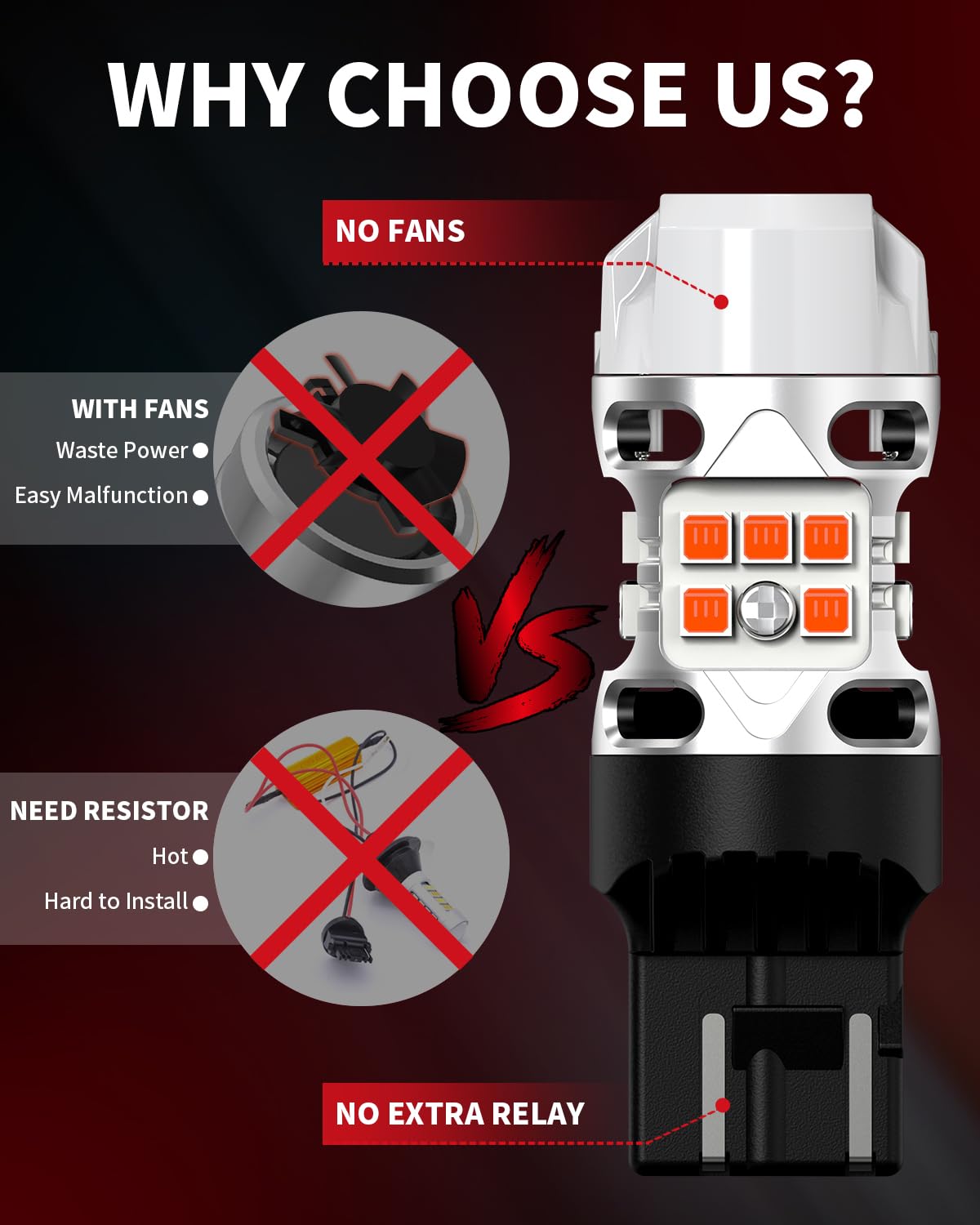 CANBUS Ready: 7440 7443 led bulb with built in resistor, solve the decoding problems of 99% vehicles. Perfectly fits for front/rear turn signals, no more having to hack your wiring to ensure you avoid "bulb-out" warnings, no more hyper flash. However they will still hyper flash on Dodge Ram trucks, if you own the above trucks, please don't purchase these bulbs