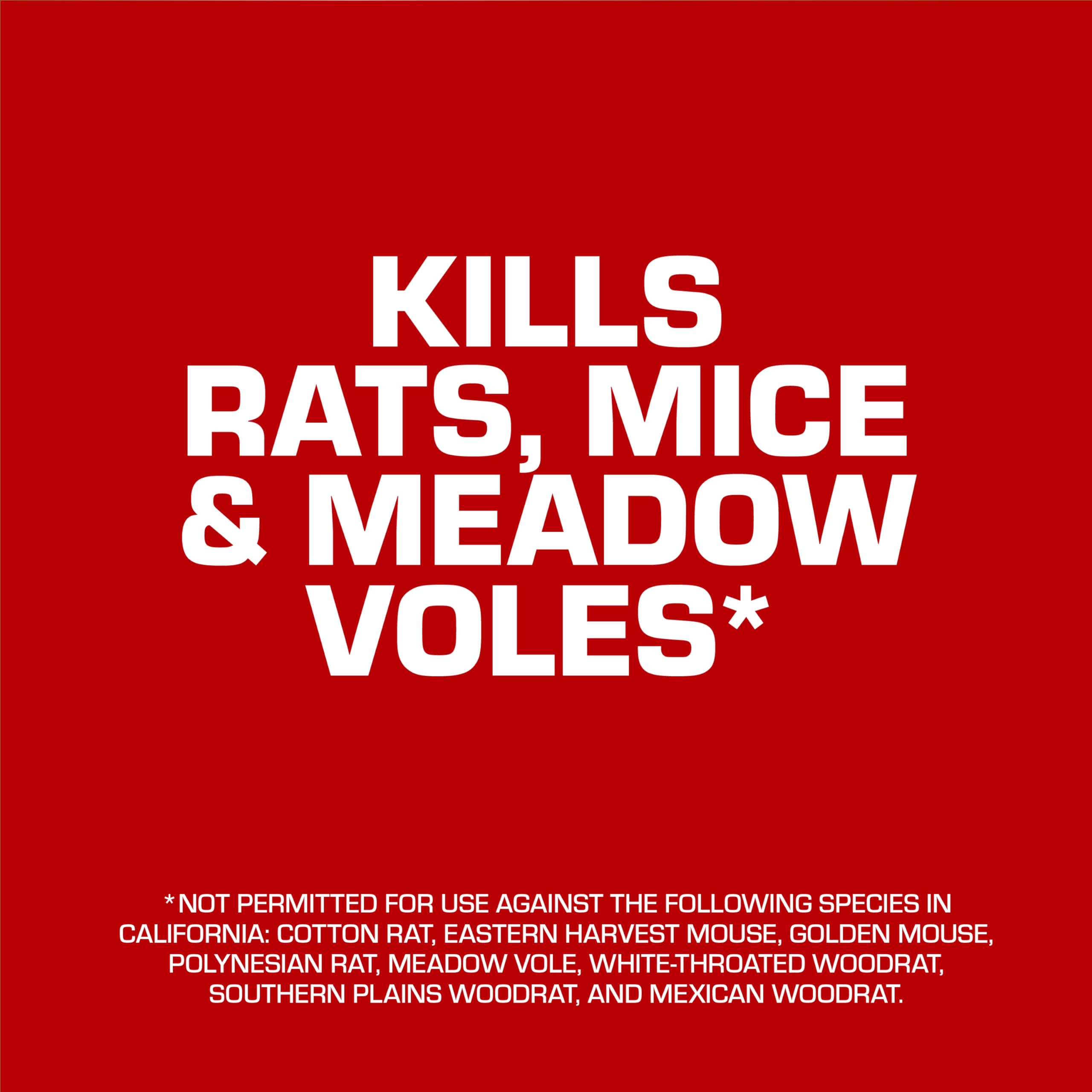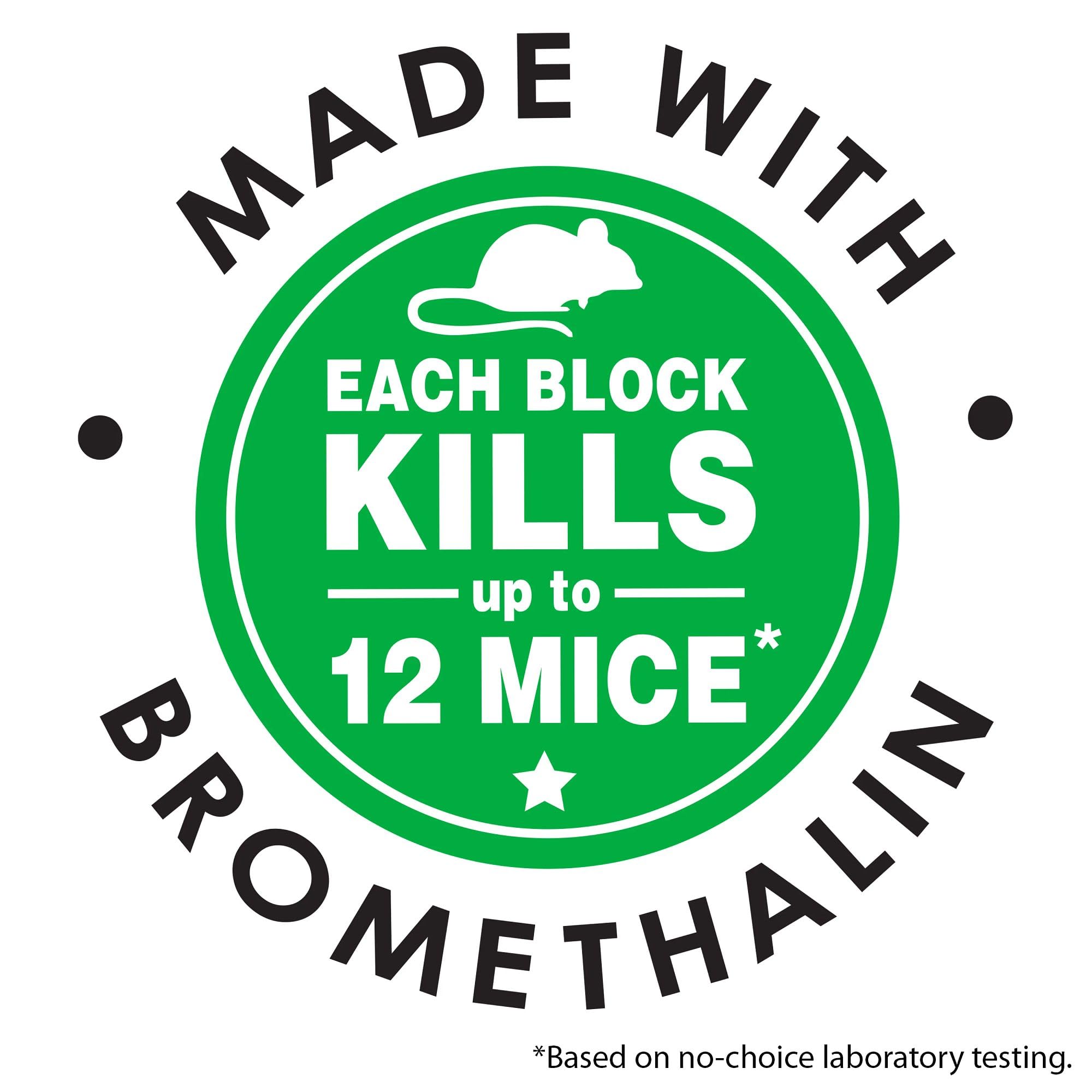 Norway rats, roof rats, and house mice cease feeding after consuming a toxic dose; each block kills up to 12 mice (based on no-choice laboratory testing)