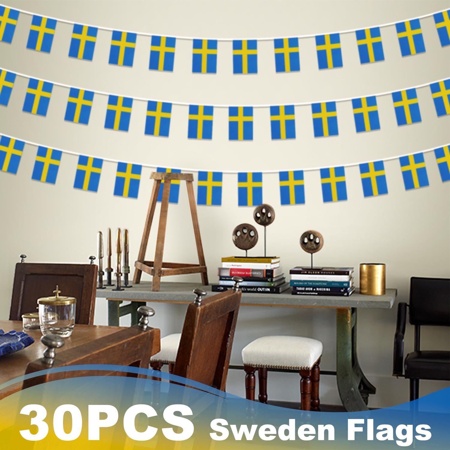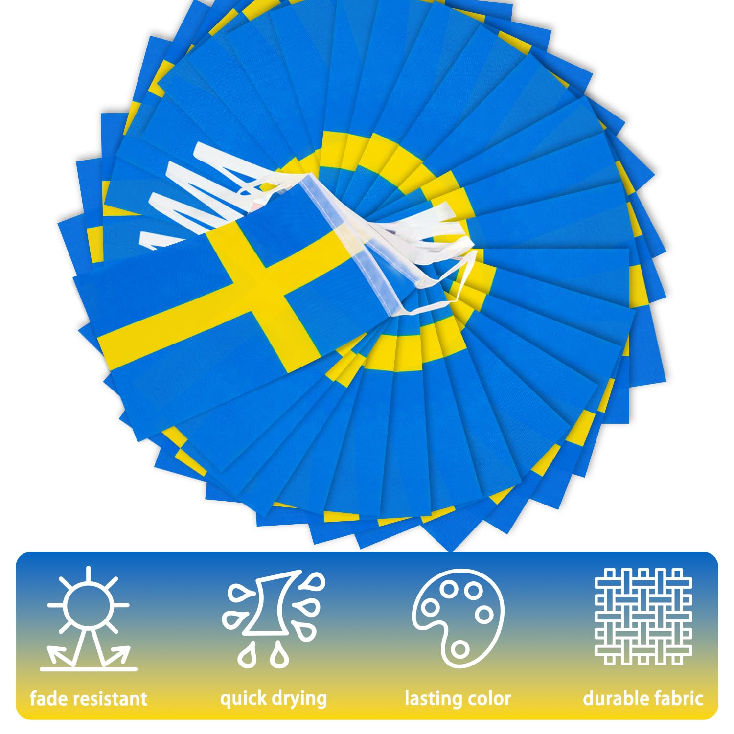 【Specifications】Each string is approximately 33 feet long. Includes 30 pcs Swedish flags. Each flag is approximately 5.5 in wide and 8.2 in long.
