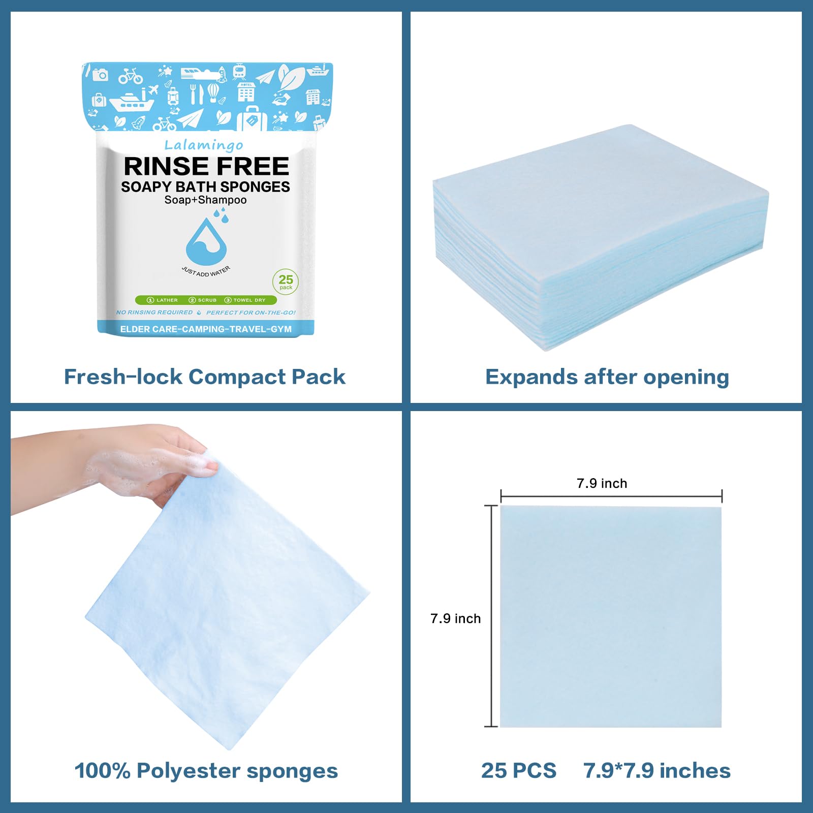 Why So Many Bubbles? Traditional no-rinse bathing wipes only have one soap coat, but our soapy sponges boast multiple layers. Rich soap, shampoo, plus quick-lathering pore sponge sheets—an ideal combination! Add water, rub, and bubbles foam up wildly—endless fluffy bubbles that make cleaning effective and easy!
