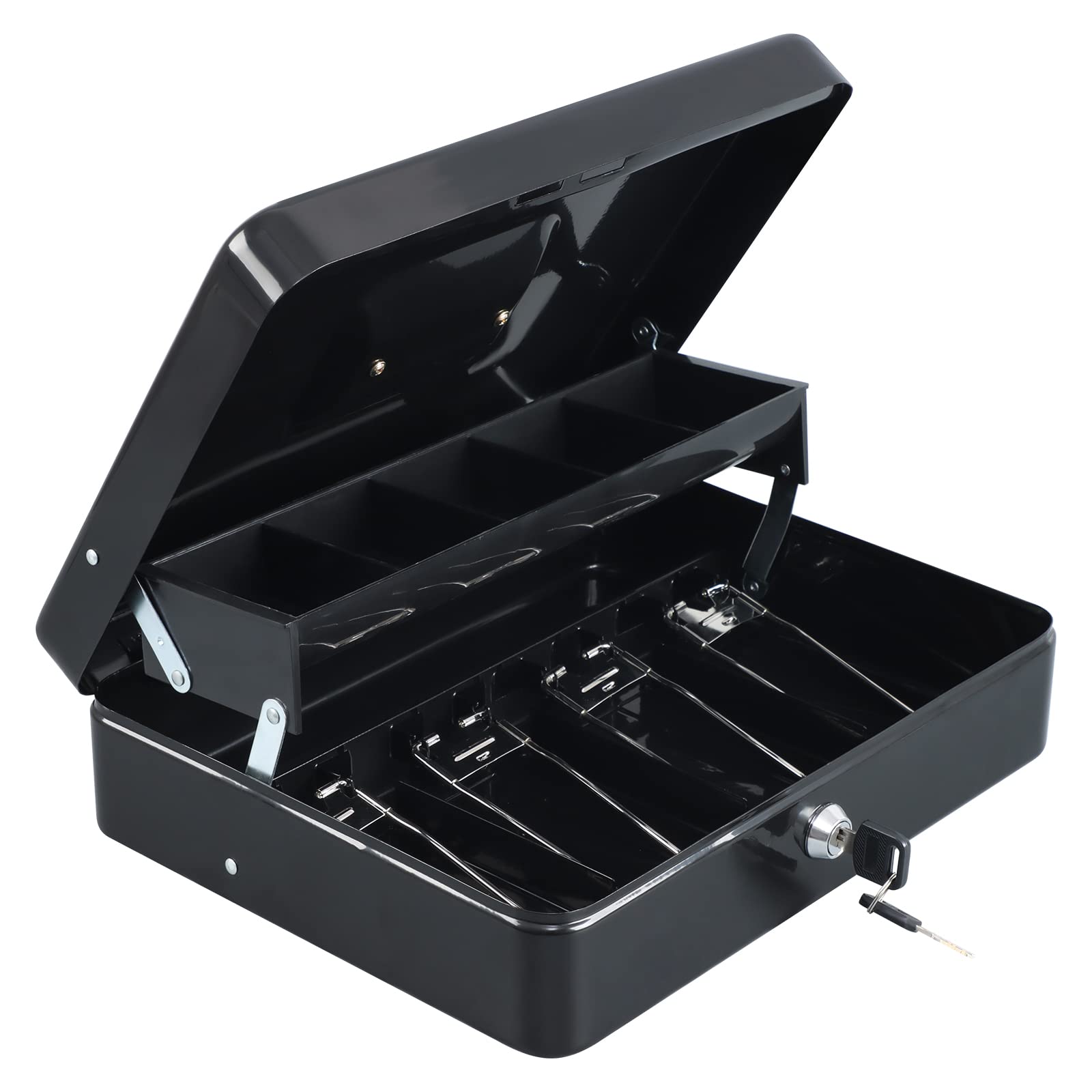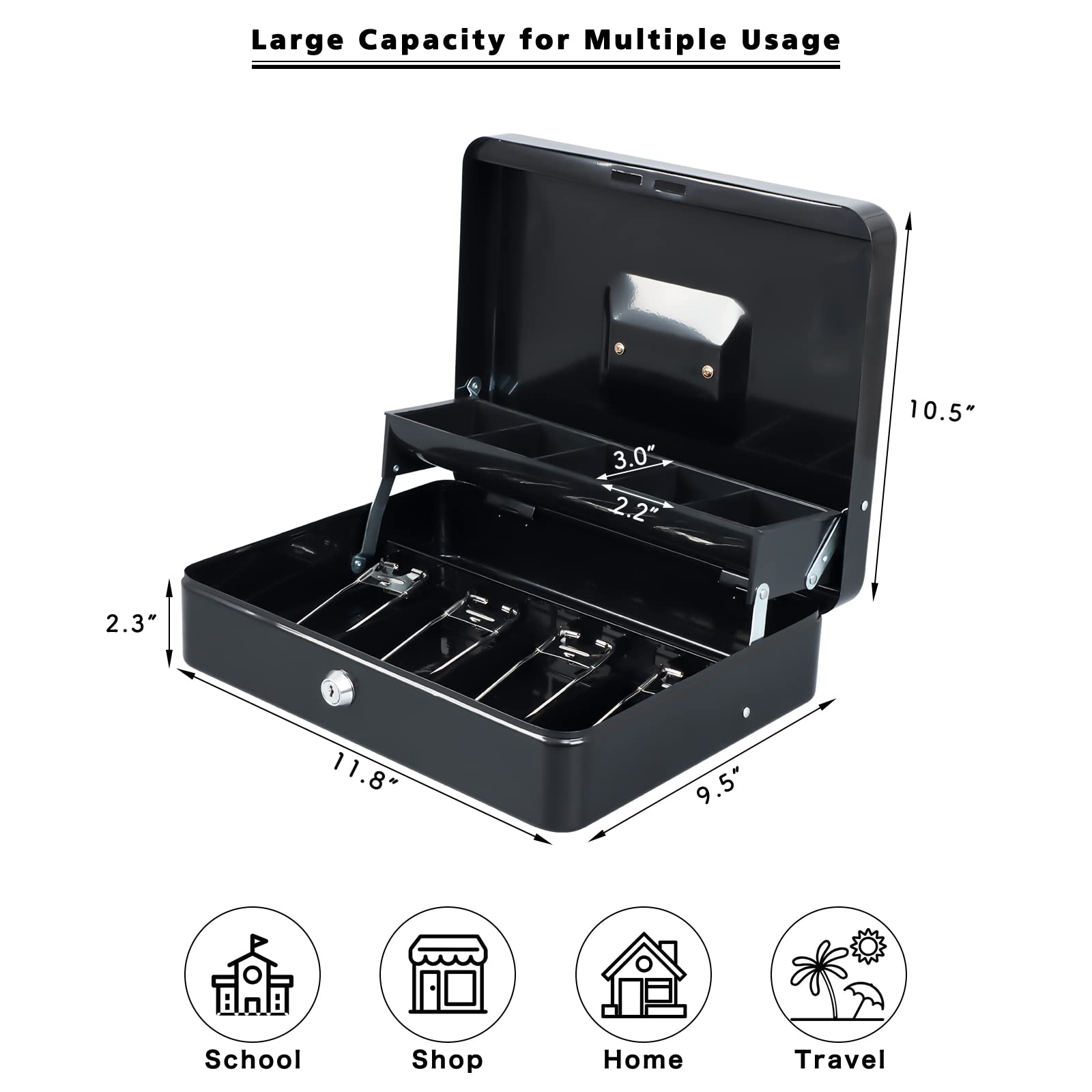 【KEY LOCK】A privacy key lock with 2 keys can keep your valuables safe. One key is for your daily use, another key can be used as a spare key.The dimension of the cash lock box is 11.8 x 9.45 x 3.54 inches.