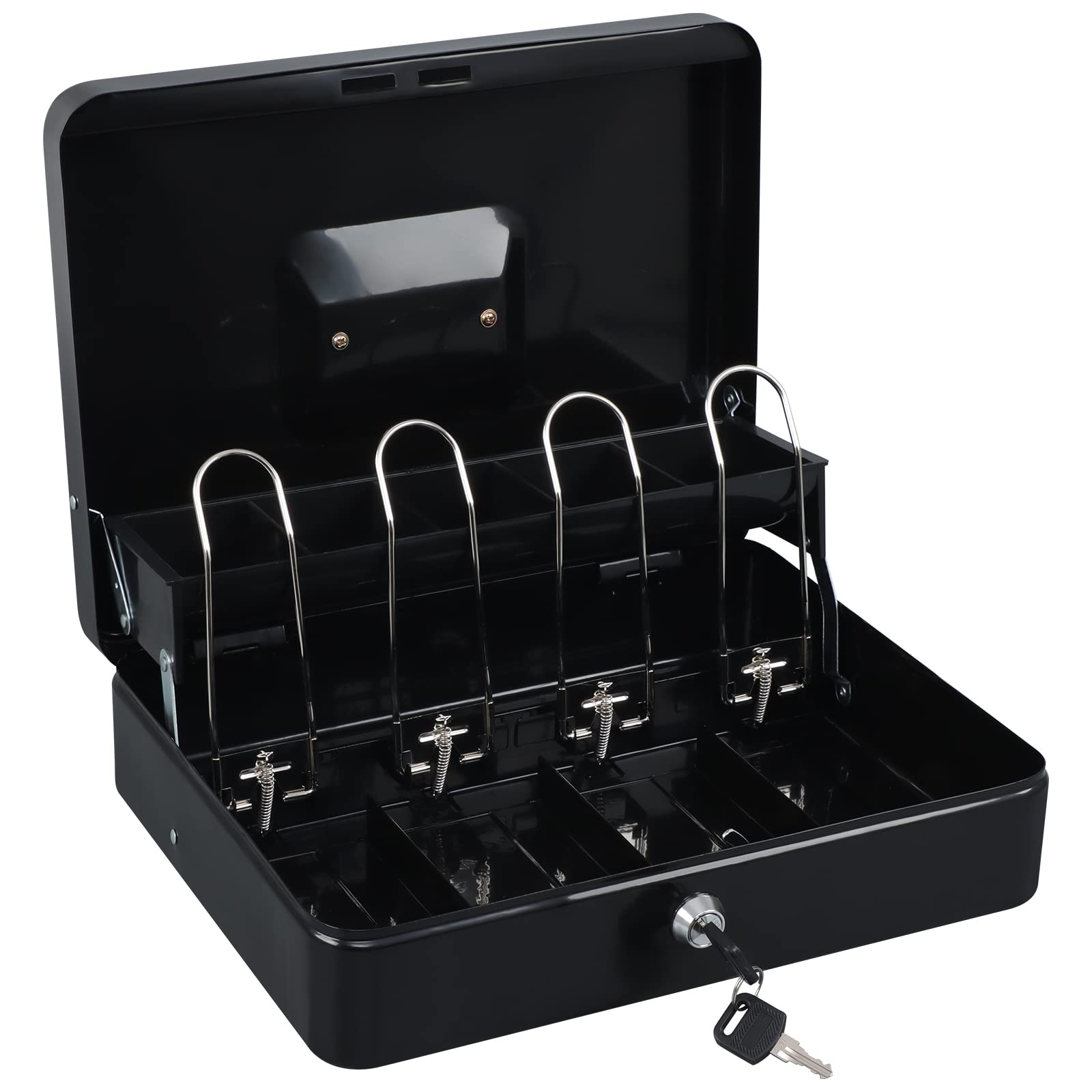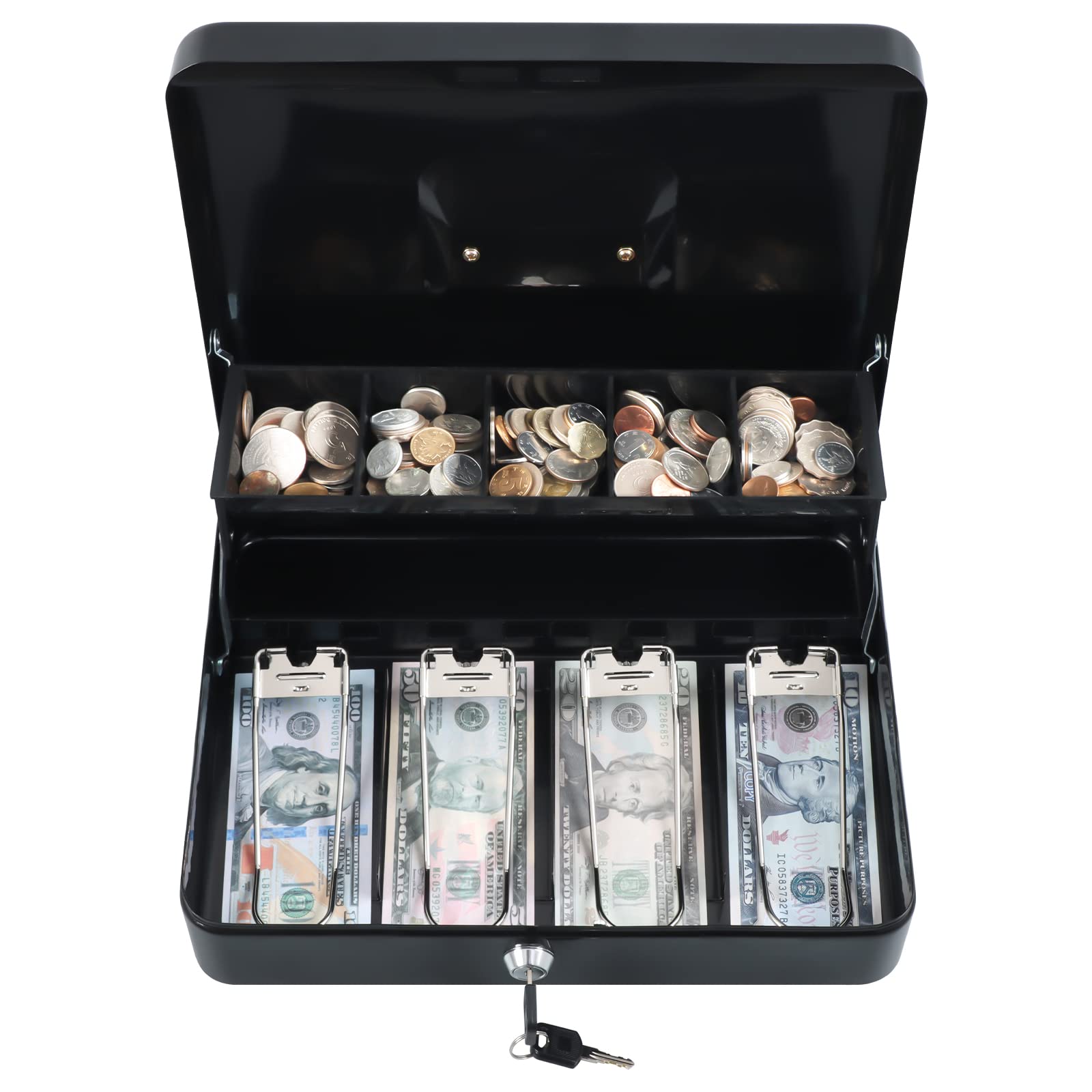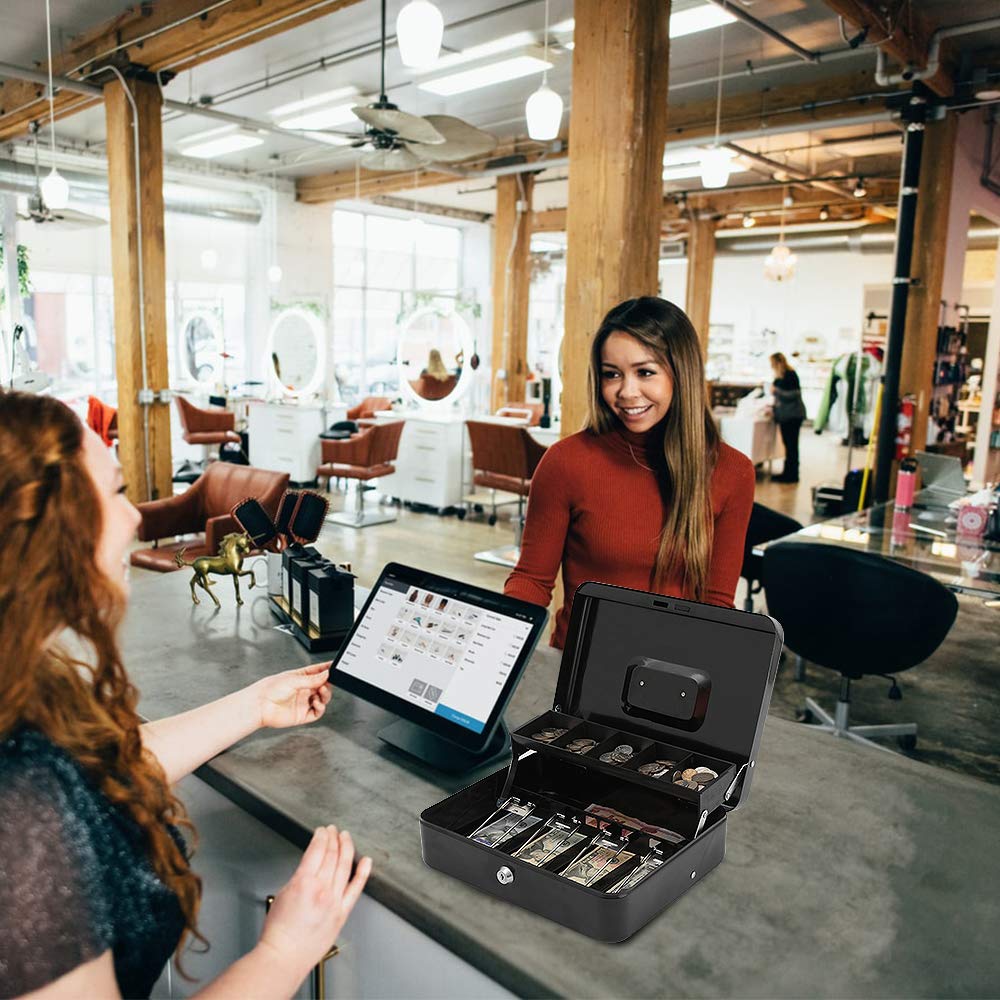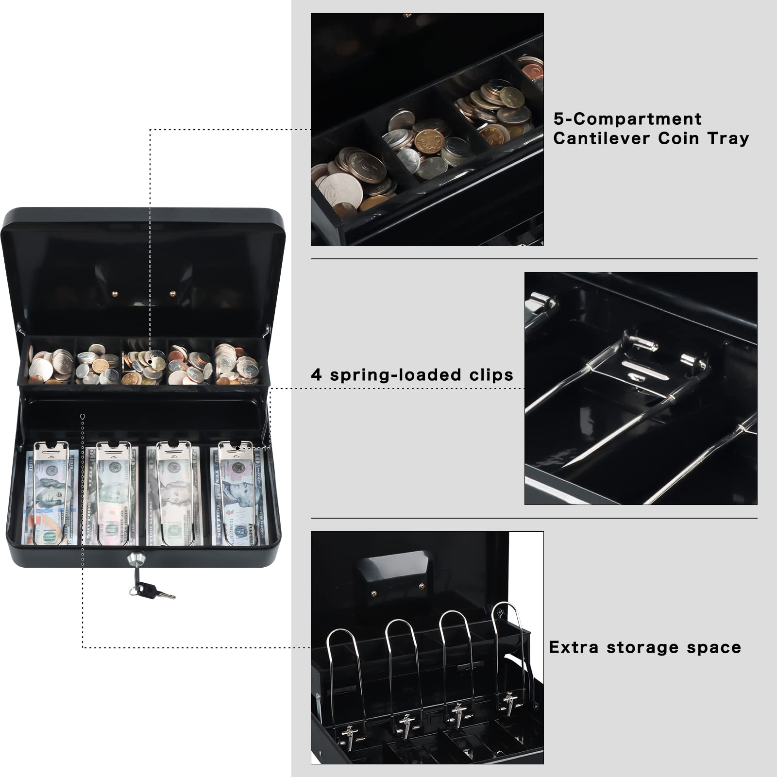 【TIERED AND CANTILEVER DESIGN】Unique, convenient tiered tray design allows for full view of entire working area. Five-compartment cantilever coin tray automatically opens for use when lid is opened. Four spring clips at the bottom of cash box can make your bills be well organized, they hold bills in their place even in a windy outdoor environment.
