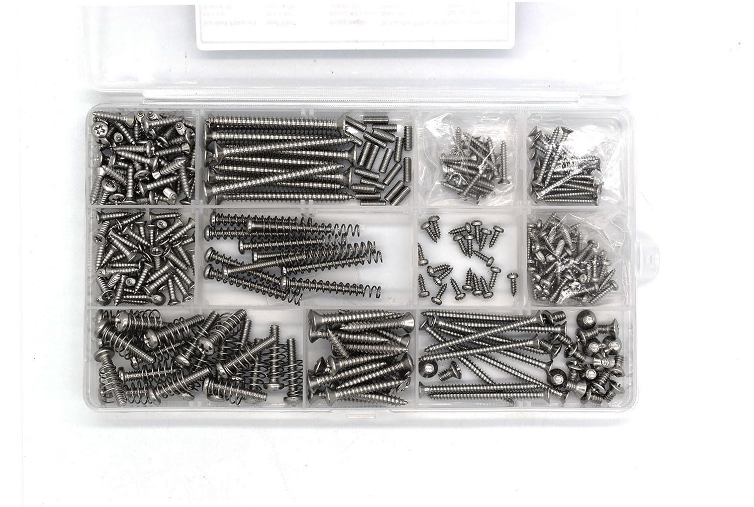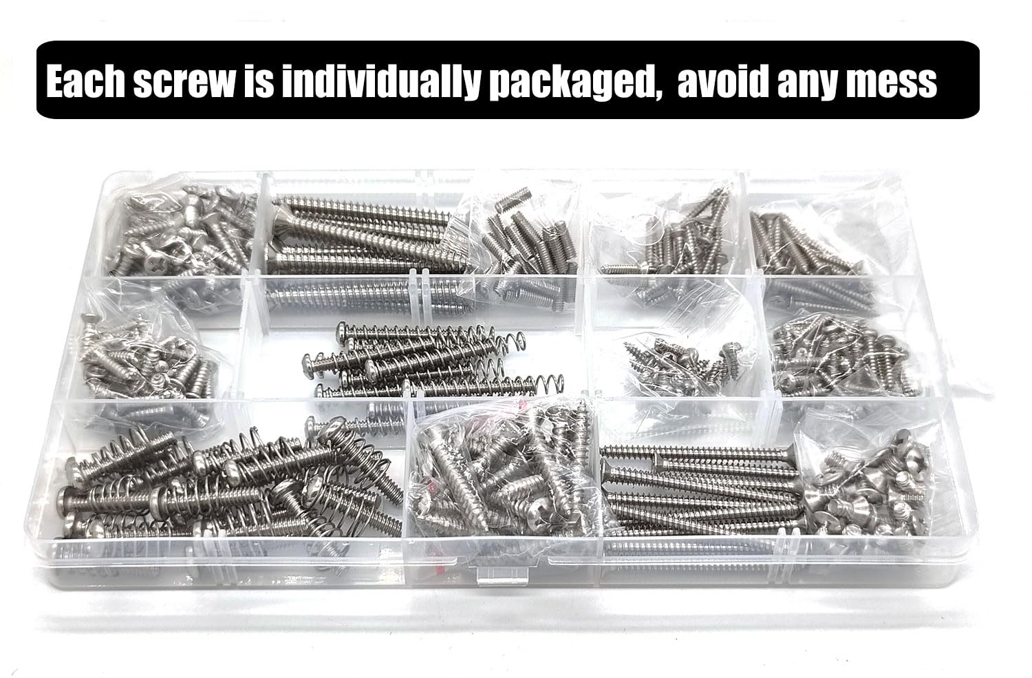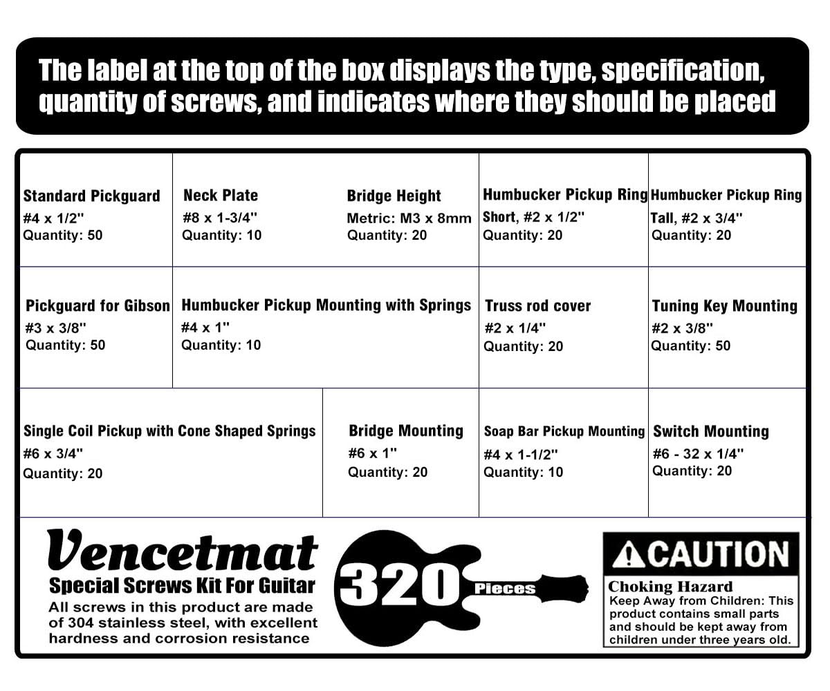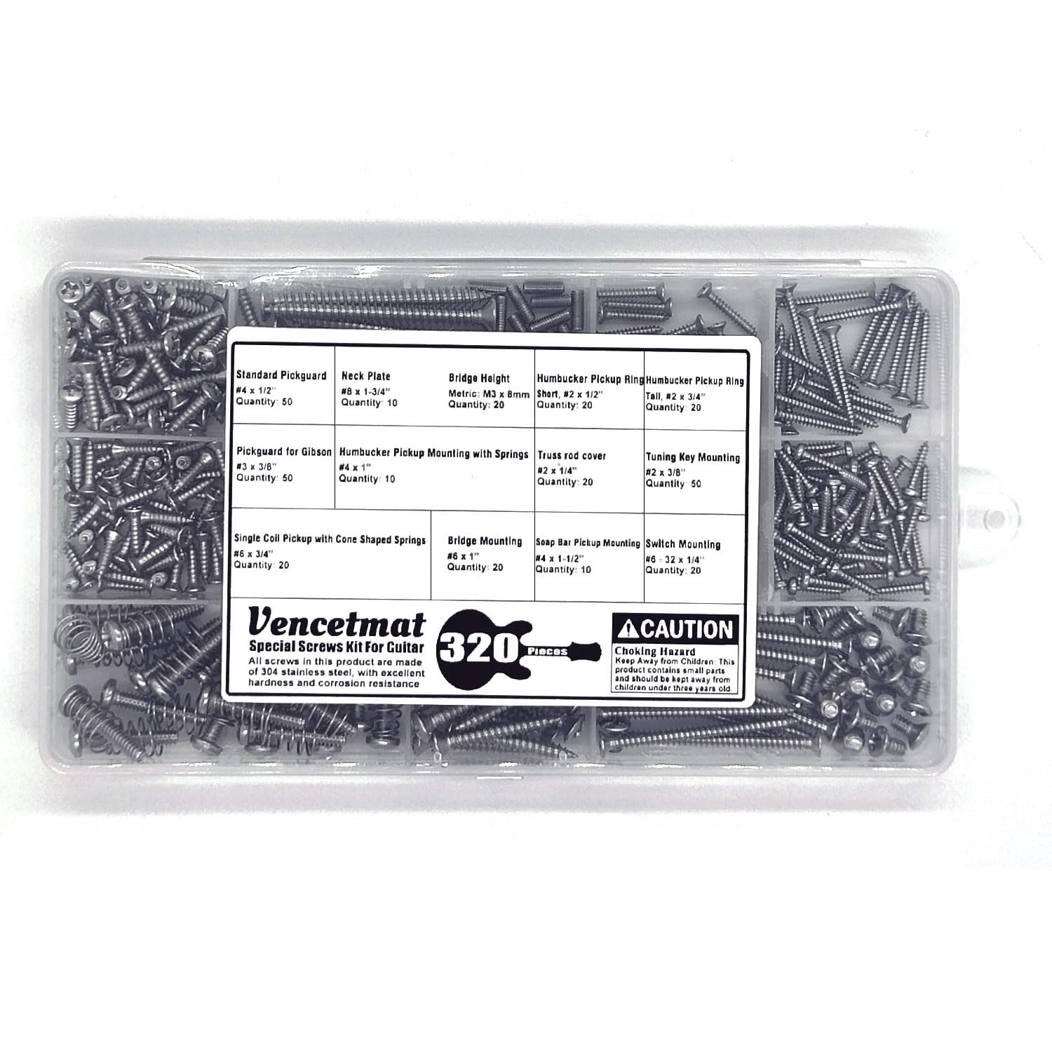 Made of 304 stainless steel,Weak magnetism. 304 steel is often referred to as "food-grade" steel, as it is unreactive with most organic acids. For guitars, exposure to organic acids is usually through perspiration and airborne moisture, and a good corrosion-resistant fastener is a good solution. Brinell Hardness=300, Three times harder than ordinary metals. keep away from screwloose,slip and rust. The 13 Types(320pcs Total) as follow: 1.For fender style or standard pickguard, amplifier logo,backplates mounting screws, 50pcs. 3.For Neck Plate, 10pcs. 2.Metric Bridge Height,20pcs. 4.Tall and Short Humbucking pickup ring,40pcs total, per 20. 5.For Gibson Pickguard screws,50pcs 6.Humbucking pickup mounting with springs, 10pcs. 7.For Truss Rod Cover,20pcs. 8.For Enclosed small size tuning keys,50pcs 9.For Single coil pickup with cone shaped springs,20pcs. 10.For bridge mounting,20pcs. 11.Soap bar pickup mounting,10pcs 12.For selector switch mounting,20pcs. These rich contents determine its wide applicability.
