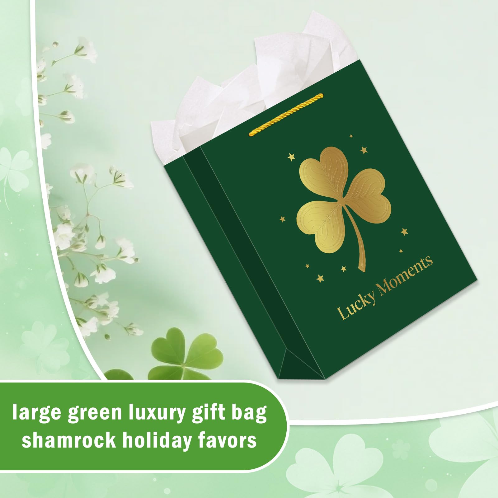 [Elegant & Sophisticated Design] Elevate your holiday gifting with the WhatSign "Lucky Moments" gift bag. Featuring a stunning deep emerald green background accented with a majestic gold-embossed three-leaf clover and sparkling stars, this bag exudes a premium feel that flatters any gift.