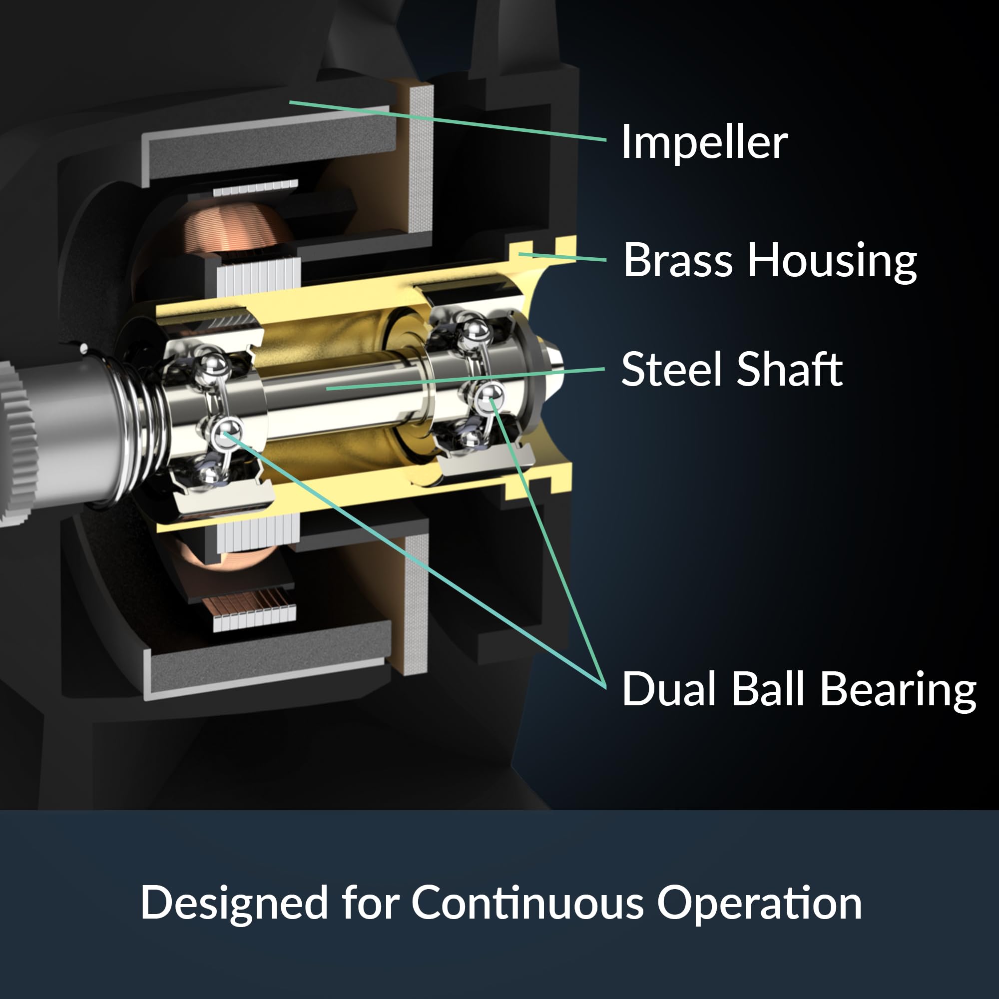 The S4028-6K's impeller is held in place by two ball bearings, making it both especially durable as well as less sensitive to external influences such as heat and dust